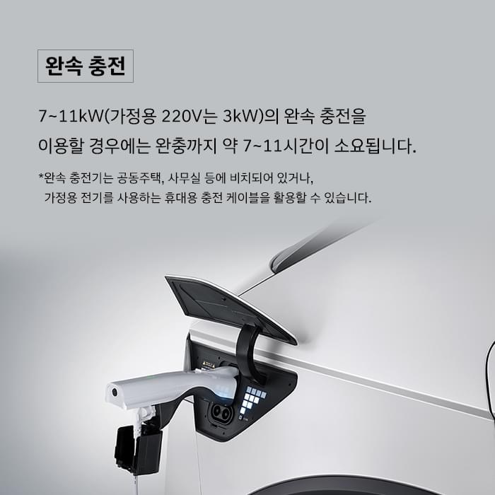 완속 충전은 7kw ~ 11kw로 가정용 220v는 3kw의 완속 충전을 이용할 경우에는 완충까지 약 7시간에서 11시간정도 소요가 되요. 밤에 꽃아 놓고 자고 일어나면 충전이 다 되어 있는 시스템으로 되는거죠.