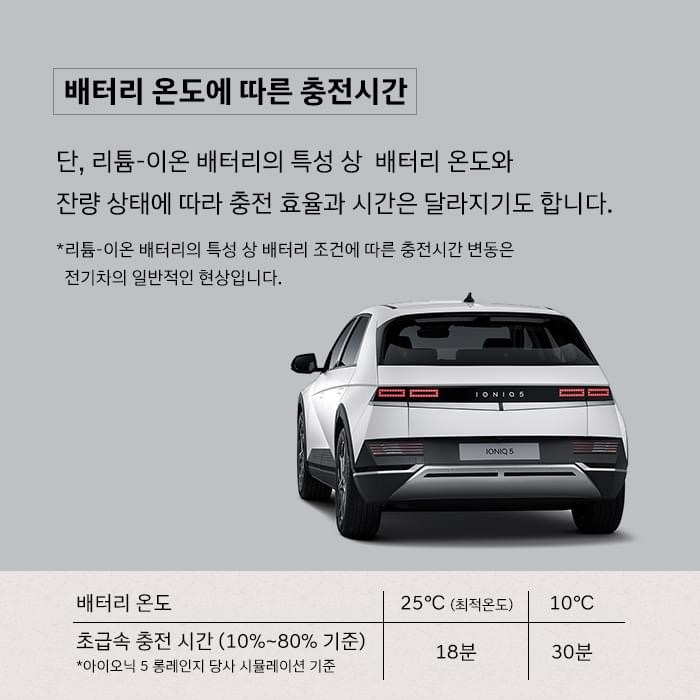 리튬 이온 배터리 온도가 25도 일때는 18분이 걸린다고 하면 10도일 경우에는 30분이 걸린다고 볼 수 있는거죠. 이런식으로 초급속 충전 시간이 배터리 온도에 따라서 확실하게 차이가 보일 수 밖에 없는거 같아요.