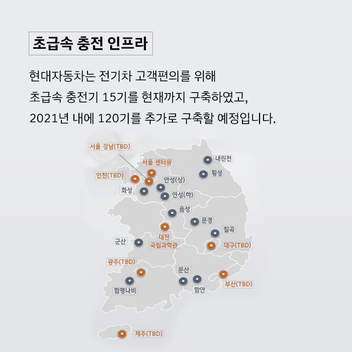 현재 현대자동차에서 전기차 고객편의를 위해 초급속 충전기를 15기를 현재까지 구축했고 2021년 내에 120기를 추가로 구축할 예정이라고 해요.