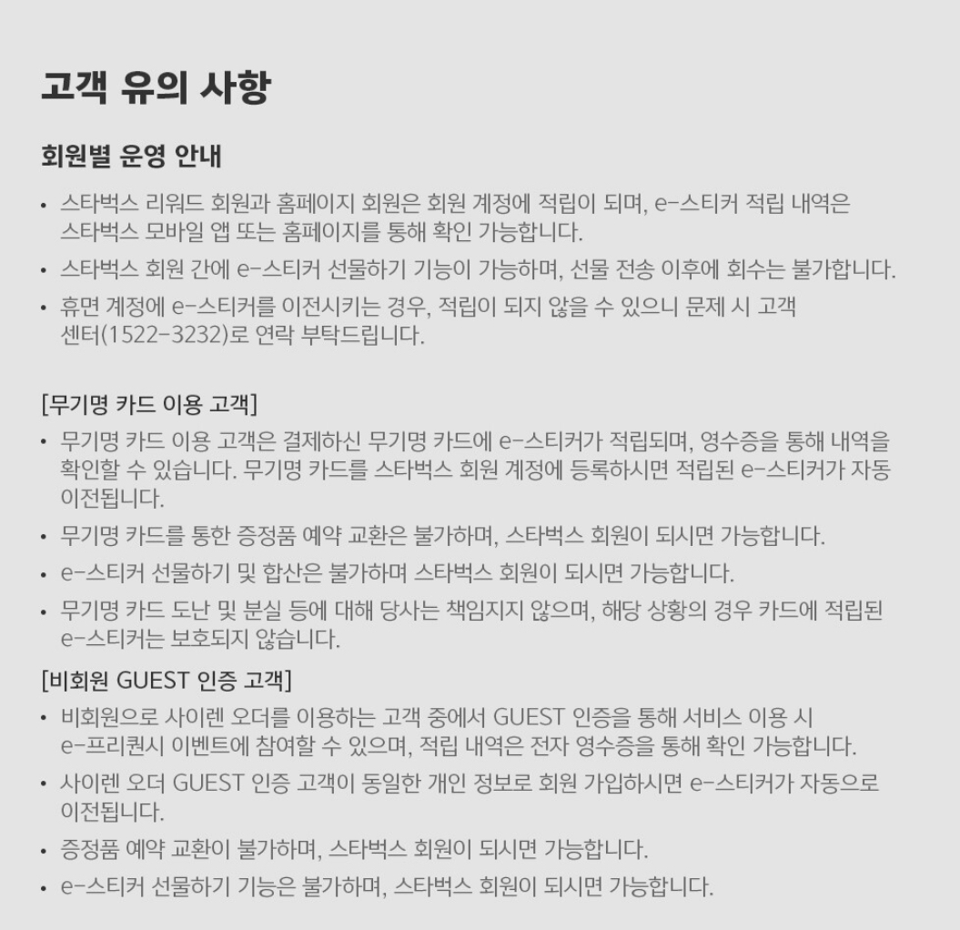고객 유의 사항이 몇가지 있는데 무기명 카드 이용 고객 같은 경우에는 영수증을 통해 내역을 확인 할 수 있고 무기명 카드를 스타벅스 회원 계정에 등록하시면 적립된 e스티커가 자동 이전이 가능해요.