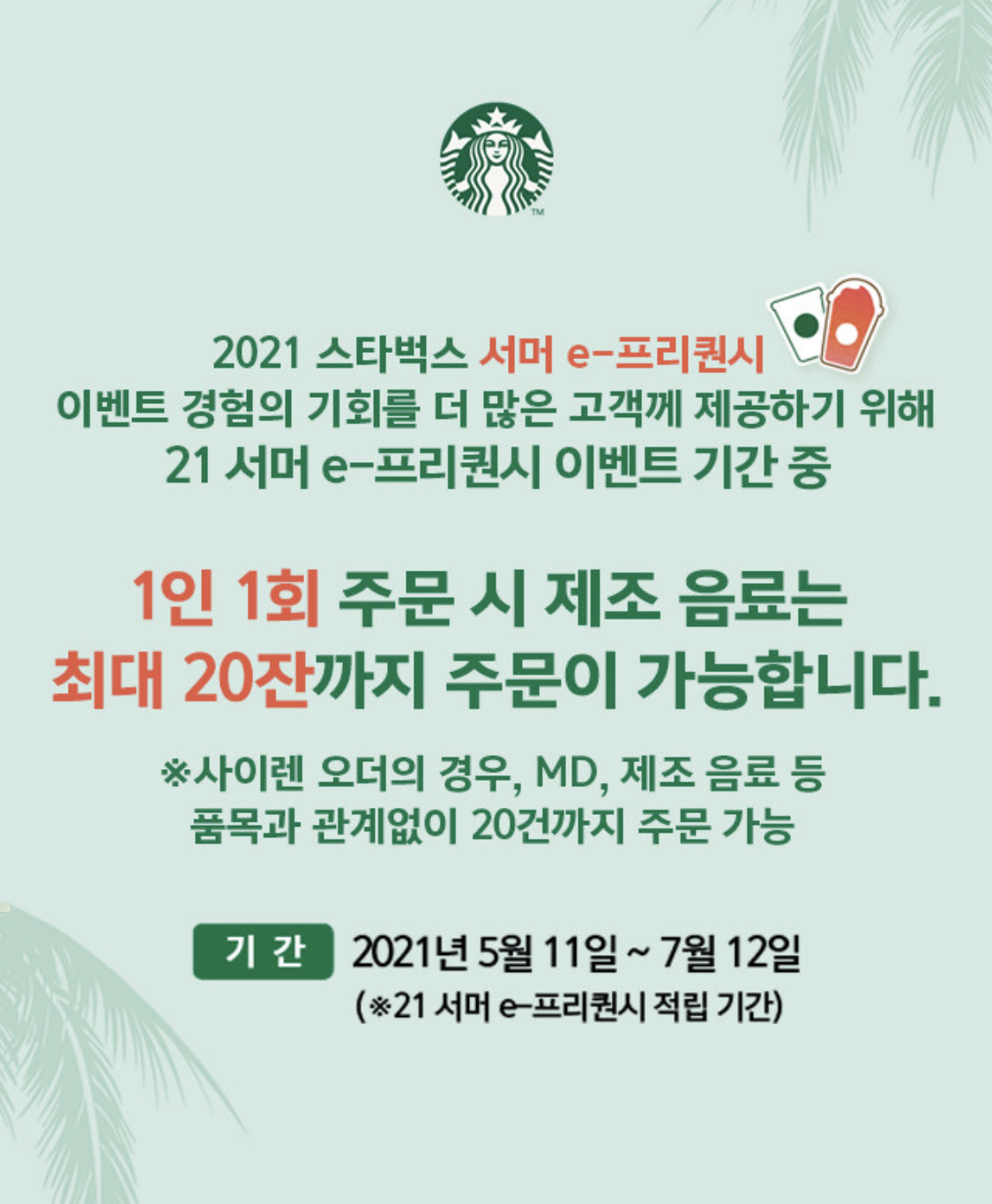 일단 제일 먼저 변경 된 사항은 작년에 한번에 100잔을 주문해서 남은 음료는 버리고 스타벅스 캐리어만 받아 갔다는 기사도 나오고 했죠. 이번에는 그 문제 때문에 1인 1회 주문시 제조 음료는 최대 20잔까지 주문이 가능하다고 해요. 근데 20잔이면 한번에 미션을 성공할 수 있는 갯수라서 의미가 있나 싶네요.