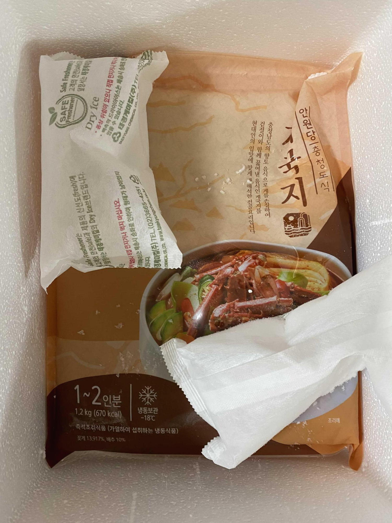 양은 1~2인분 정도 되고 1.2kg 670kcal 정도 된다고 나와 있고 즉석조리식품이라서 가열하여 섭취하는 냉동식품이예요. 꽃게는 13.917%, 배추는 10% 이렇게 기재 되어 있더라구요.