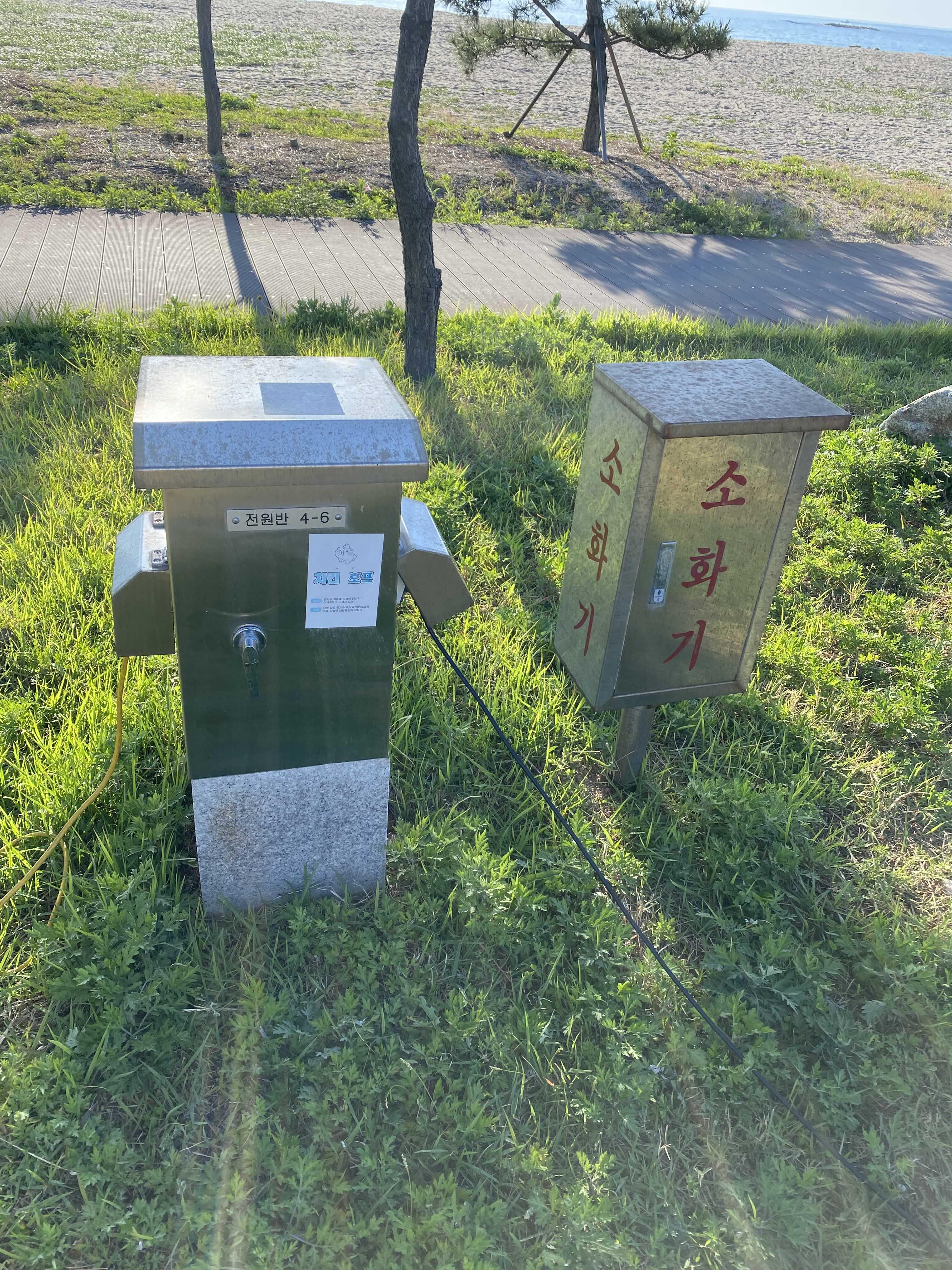 배전함은 이렇게 2자리에 1개씩 배치가 되어 있고 양쪽에서 사용하는 구조로 15미터 릴선만 있어도 충분히 사용 할 수 있어요. 옆에 든든한 소화기도 있구요.