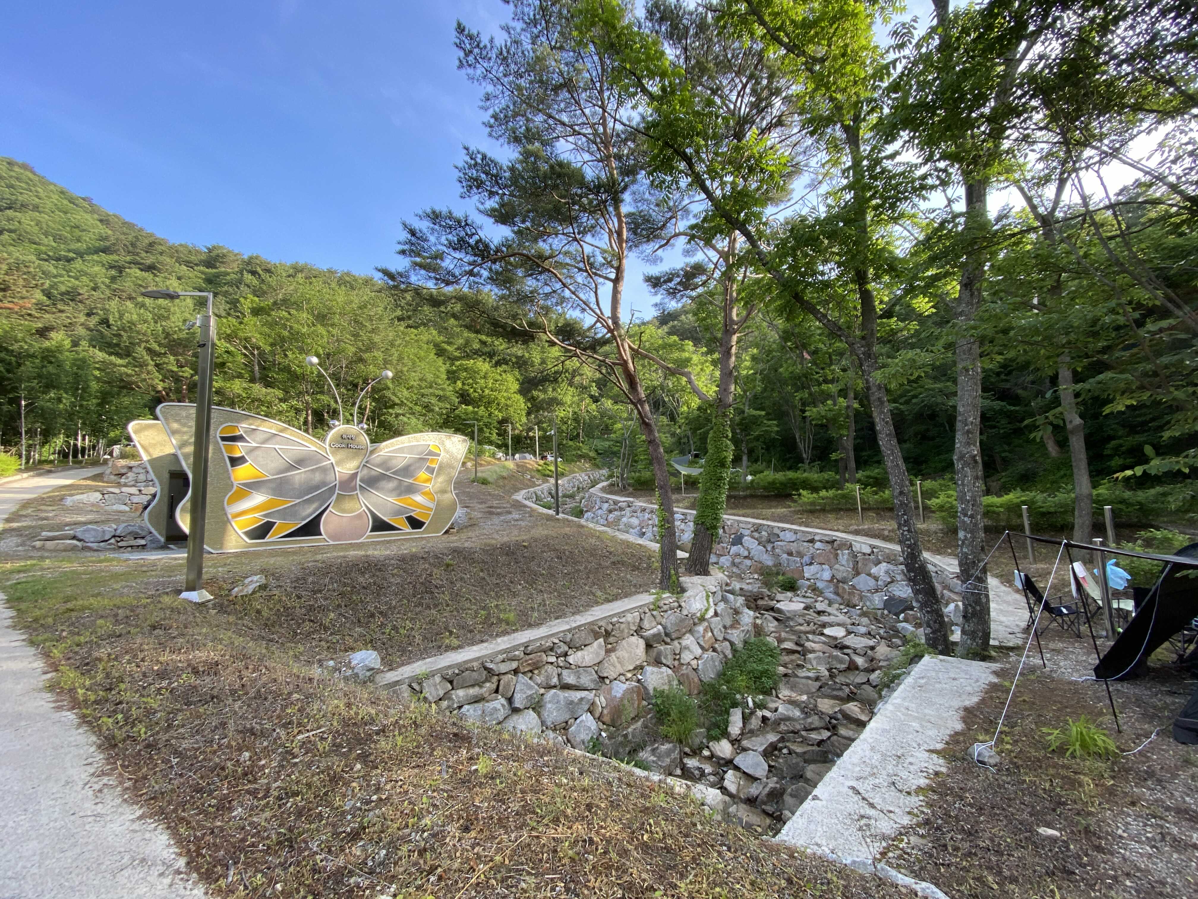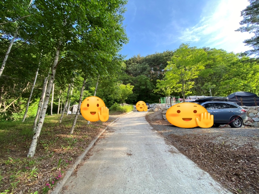 이모티콘 있는 자리가 텐트 자리인데 뒤에 나비가 보이죠?? 편의시설에서 좀 가까운점은 좋은거 같아요. 입구 자리라서 차가 지나 다니는 자리라고 보시면 되요.