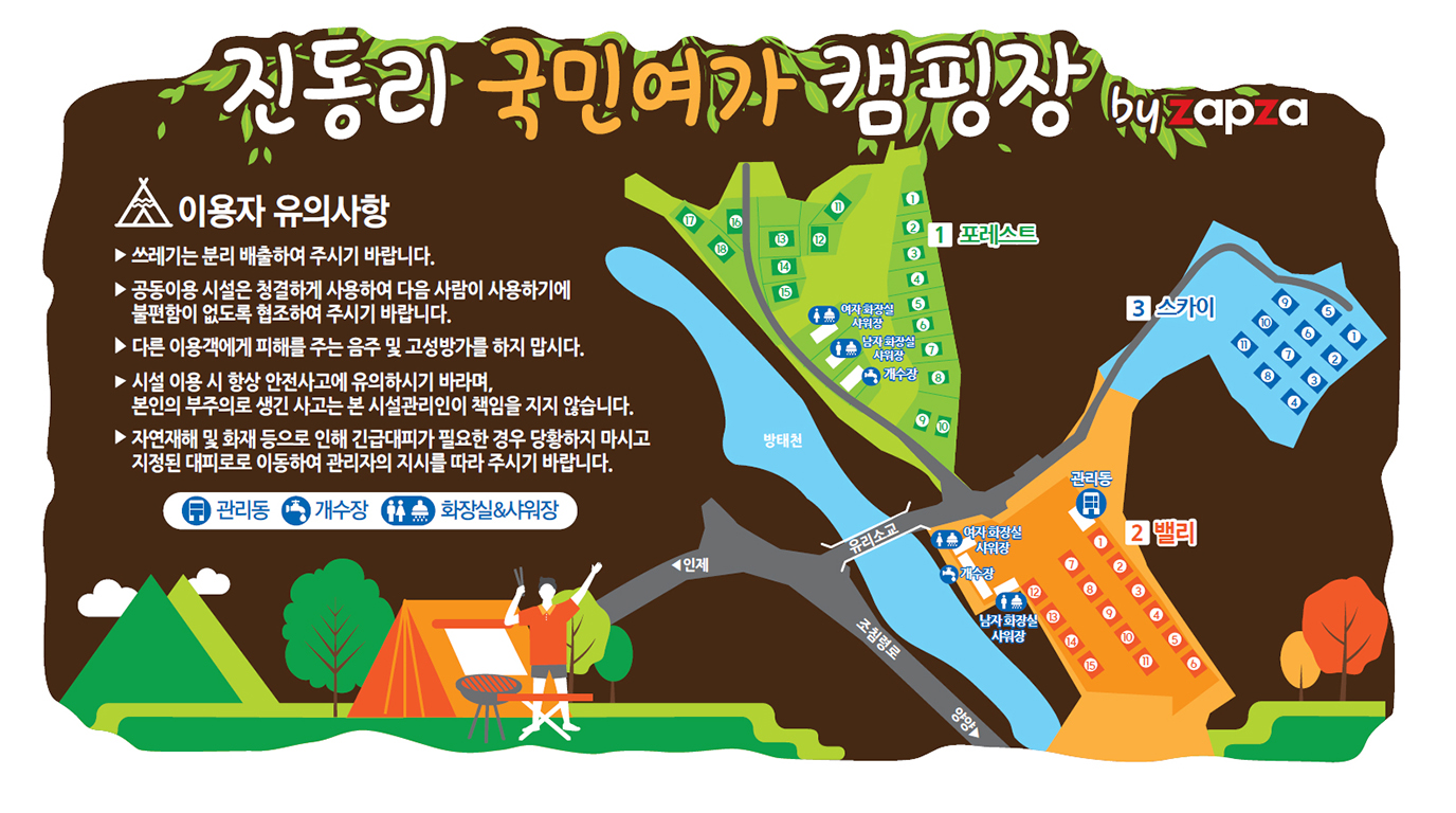지도상 보면 유리소교 다리를 건너서 왼편으로 보여지는곳이 포레스트 구역이고 체크인은 관리동에서 먼저 하시고 오시면 되요.