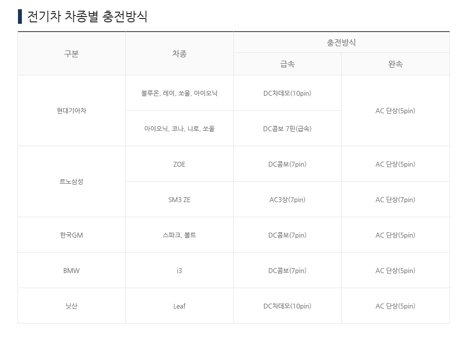 현대차랑 기아차 경우에는 블루온, 레이, 쏘울, 아이오닉은 DC차데모(10pin) AC 단상(5pin) 이용하고 아이오닉, 코나, 니로, 쏘울 DC콤보 7핀(급속) AC 단상(5pin) 을 이용할 수 있어요. 2가지다 이용할 수도 있는 차량도 있는거죠.
