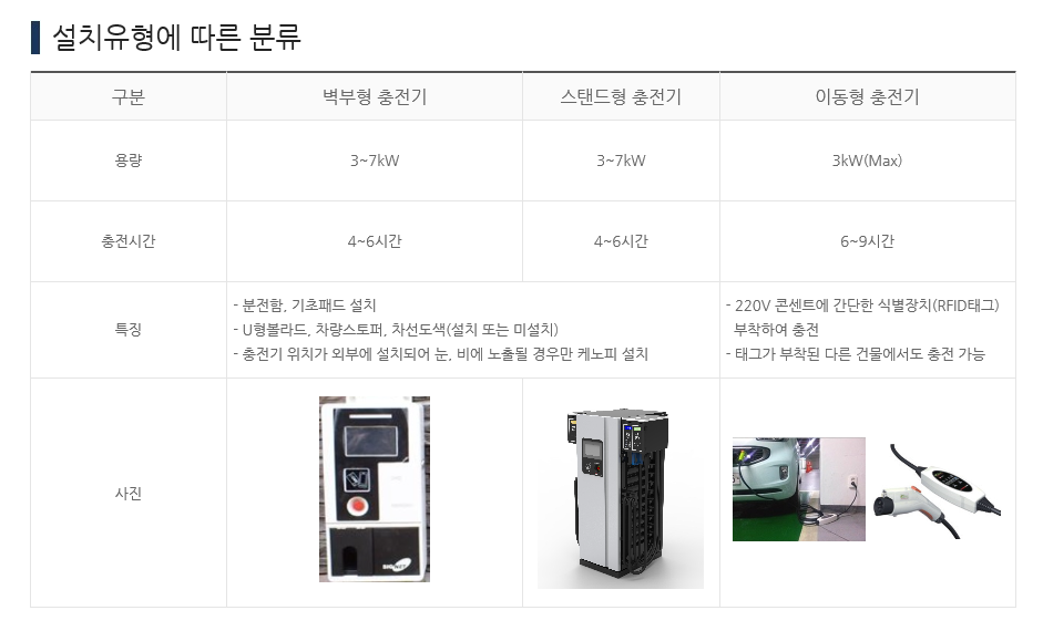 전기차 충전 시설은 설치유형에 따른 분류가 되어 있어요. 크게 3가지로 구별되고 벽부형 충전기 스탠드형 충전기 이동형 충전기 이런식으로 되어 있고 용량도 틀리기 때문에 집밥으로 충전하시는분도 계시고 환경부 전기 충전소도 있고 현대자동차 잇핏을 이용하시는분도 있고 다양하게 이용할 수 있네요.