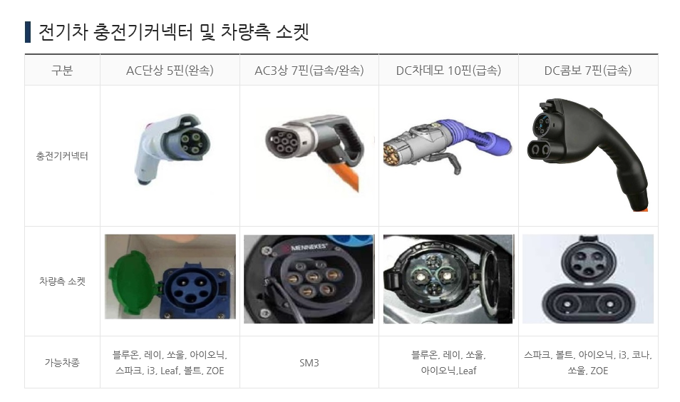 전기차 충전기커넥터 및 차량측 소켓에 따라서 구별이 되고 AC단상 5핀(완속), AC3상 7핀(급속/완속), DC차데모 10핀(급속), DC콤보 7핀(급속) 이렇게 4가지 형태로 보시면 되요.