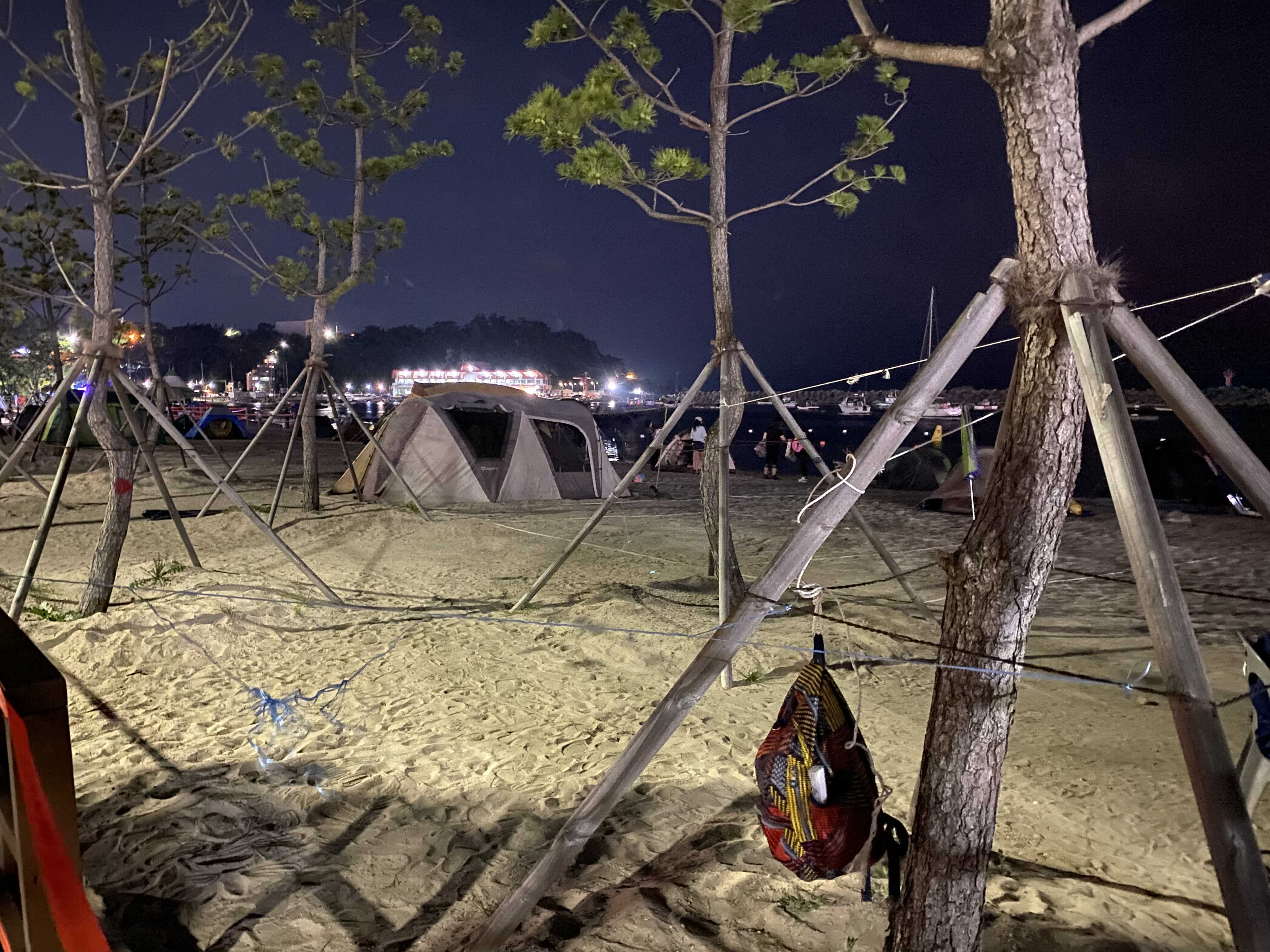 야영장안에 보니깐 사람들도 많고 거실형텐트를 치신분들도 있고 하더라구요. 여기는 일단 차에서 짐을 내려서 들고 가야되는 구조라서 너무 많은 짐이 있으면 낮에 옮기는건 진짜 힘들어요. 그리고 완전 해수욕장 모래사장에서 야영을 하는거기 때문에 전기는 당연히 안되고 블랙코팅타프나 그늘을 만들 수 있는 공간이 없으면 텐트안은 너무 더워서 기절 하실지도 몰라요.