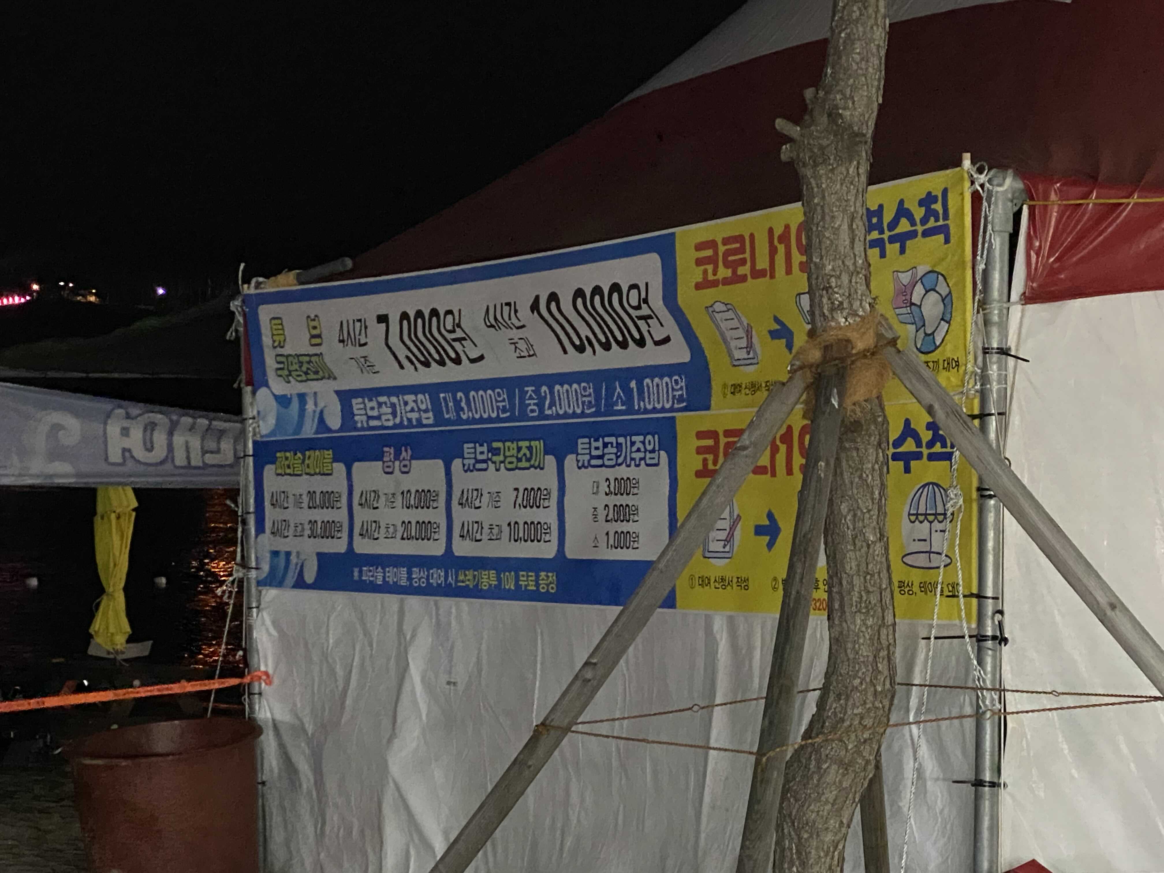 튜브대여비, 구명조끼 대여비는 4시간 기준으로 7,000원, 4시간 초과 10,000원 이렇게 해서 대여도 해주고 튜브공기주입은 큰 튜브가 3,000원 중간 튜브가 2,000원 작은 튜브가 1,000원 이렇게 바람 넣어 주는것도 돈을 받더라구요 ^^