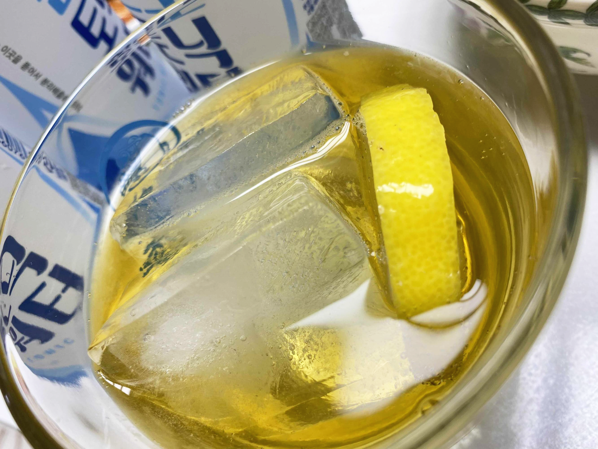 얼음 3개 + 골든블루 더 사피루스 위스키 1잔 + 진로 토닉워터 3잔 + 레몬 1조각 = 골든블루 더 사피루스 하이볼 완성