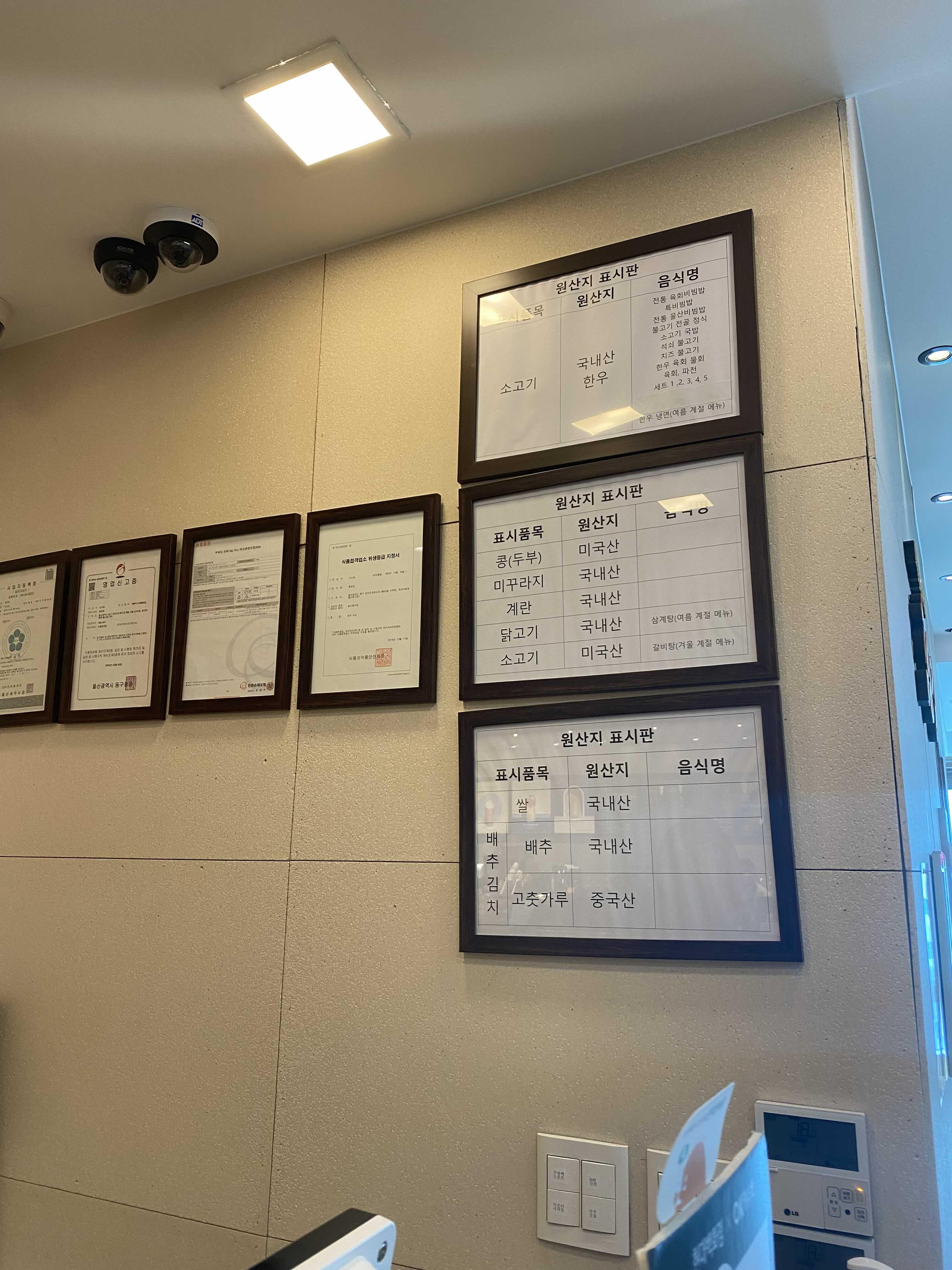 소고기 국내산 한우, 콩 두부 미국산, 미꾸라지 국내산, 계란 국내산, 닭고기 국내산 , 갈비탕 소고기 미국산, 쌀 국내산, 배추김치, 배추 국내산, 고춧가루 중국산 이렇게 정확하게 표시가 되어 있어요.