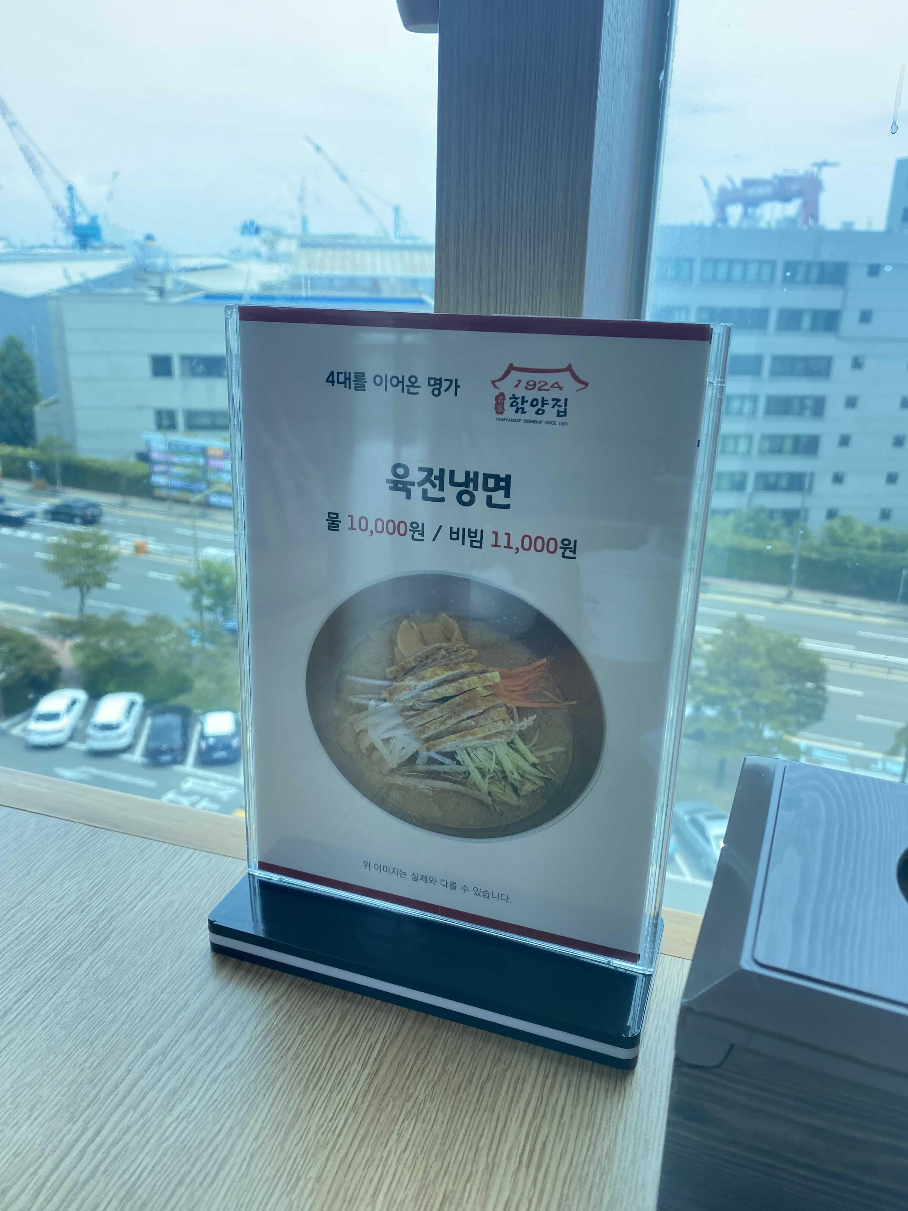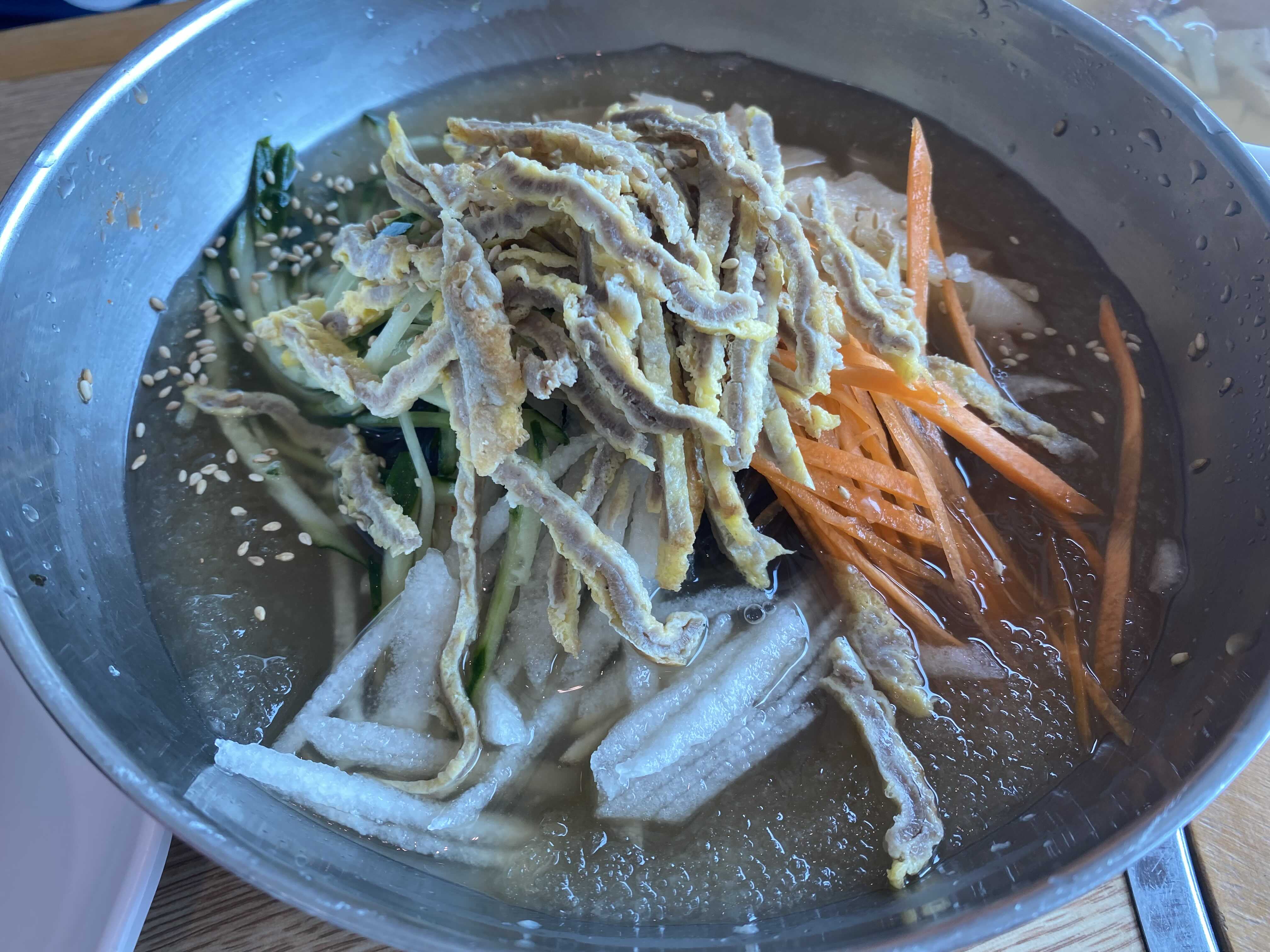 냉면에 육전이 썰어서 올라갔다고 보시면 되요. 일반 냉면이랑 비슷한데 육전이 추가 됐다?
