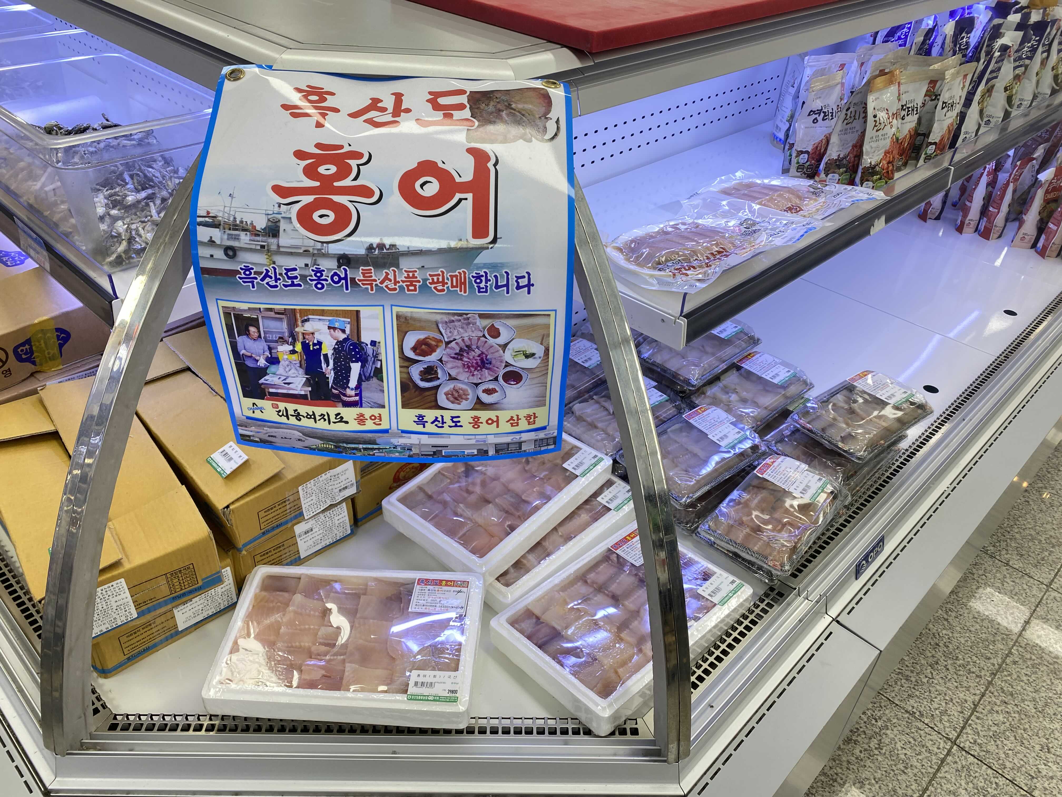 보통 국산 홍어를 하나로마트에 팔지 않는데 여기는 흑산도 홍어 국내산을 팔아요. 소포장 되어 있어서 여기 계시는 현지도민분들이 많이들 사서 가시더라구요. 흑산도 홍어 전문점에 가면 기본 50,000원정도부터 시작하는데 여기는 착한가격에 국내산 흑산도 홍어를 맛볼 수 있어서 좋은거 같아요.