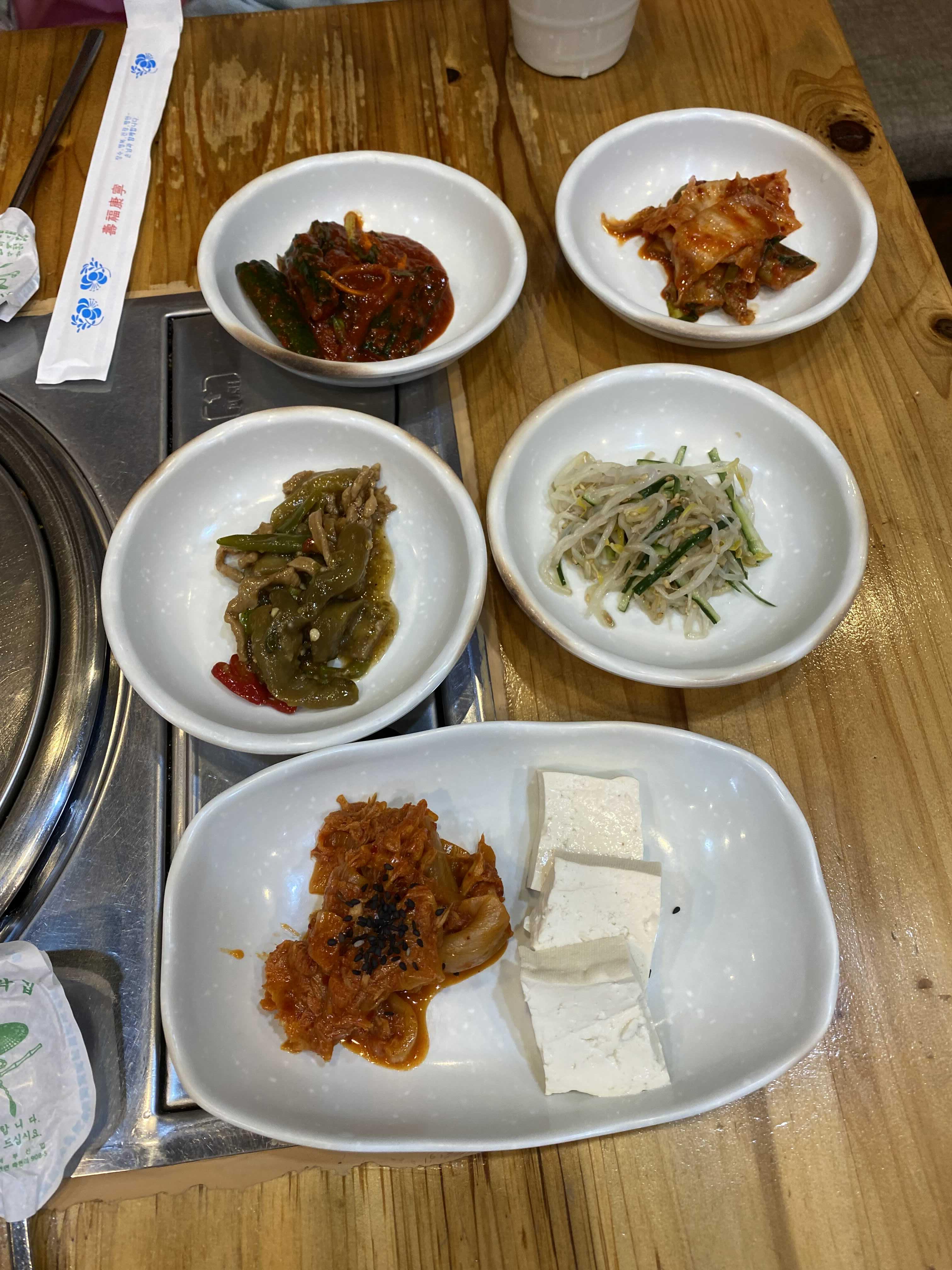주문하고 나니깐 이렇게 밑반찬이 나왔어요. 한 7가지 나왔는데 별거 아닌거 같지만 맛이 있더라구요 ㅋㅋㅋ