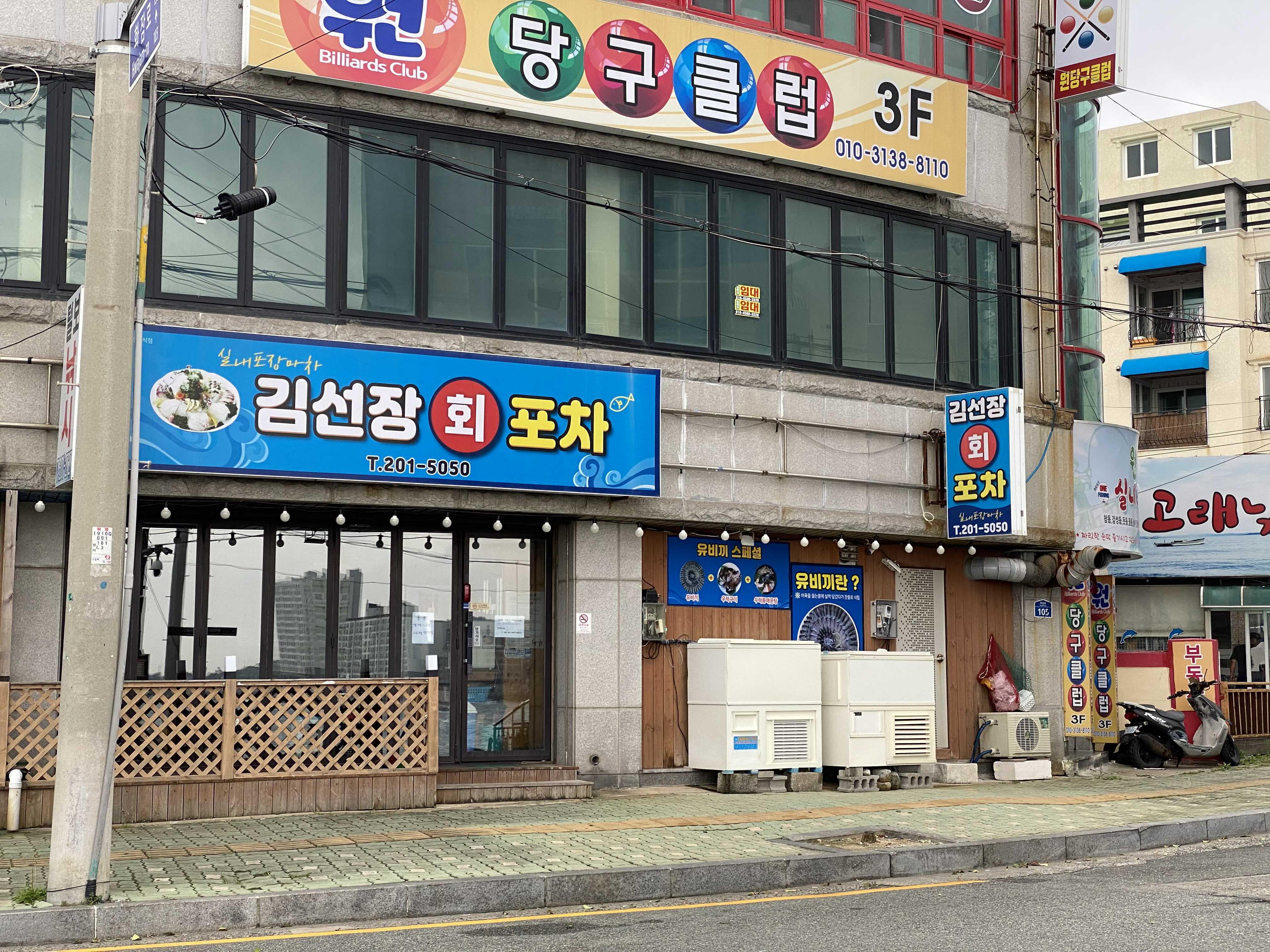 꽃바위 바다소리길 건너편에 꽃바위에서 나름 유명한 김선장 회포장 가게도 있는데 유비끼 회랑 직접 선상에서 잡아오는 자연산 횟감으로 유명하다고 하더라구요. 아마도 캠핑장 생기면 손님이 더 늘어나지 않을까 싶네요 ㅋㅋㅋ