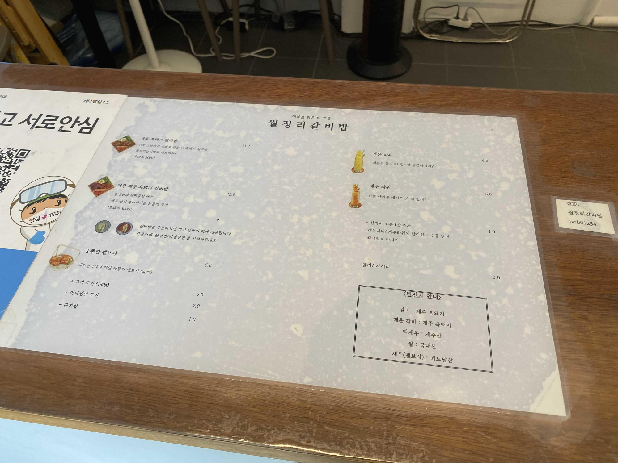 제주 흑돼지 갈비밥, 제주 매운 흑돼지 갈비밥, 뚱뚱한 멘보샤, 제주타워, 레몬타워 이렇게 있어요.