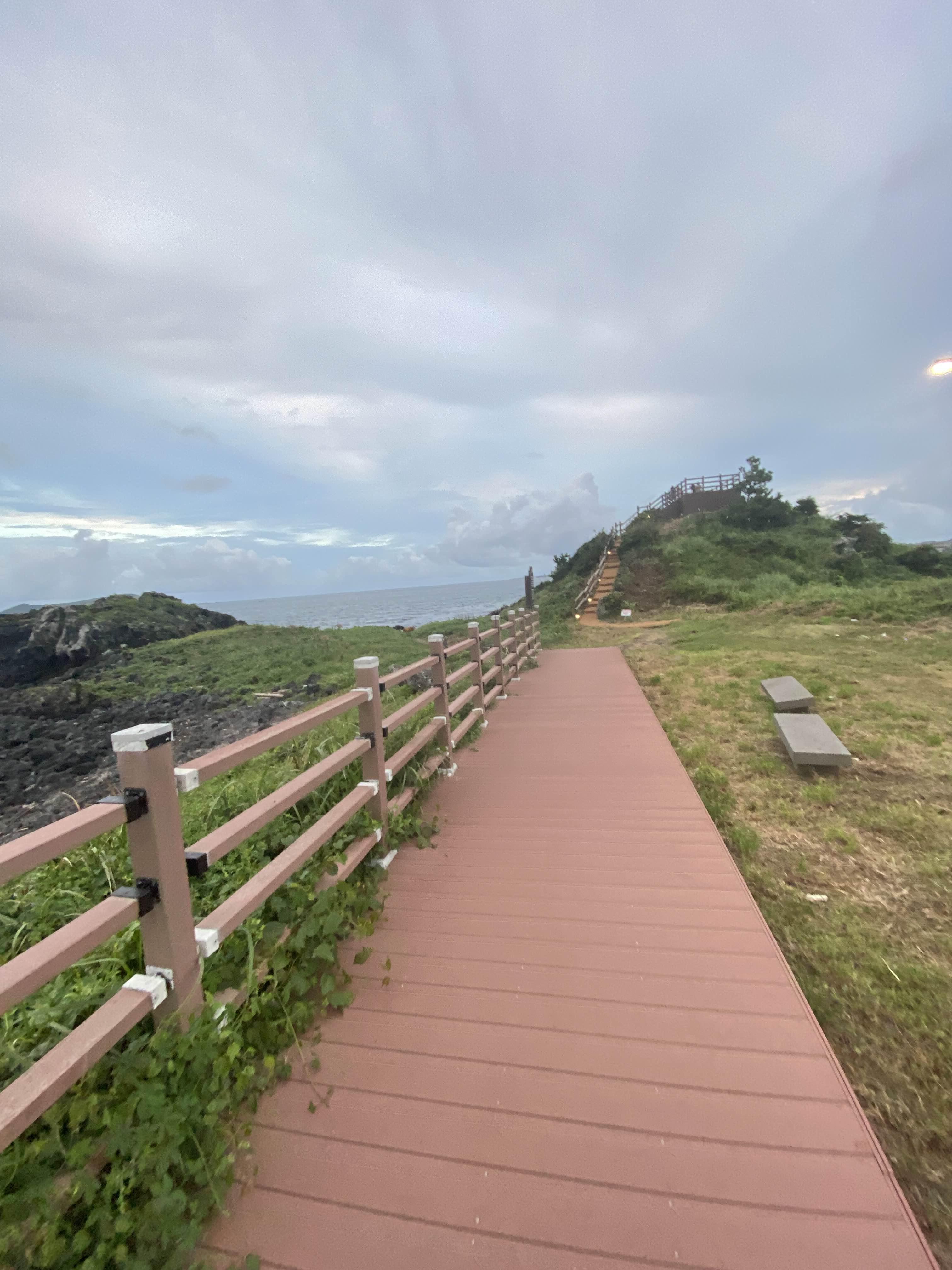 날씨가 좋으면 훨씬 더 잘 보일거 같긴 한데 이 날은 날씨가 너무 안좋아서 이쁘진 않았어요. 거기에 바람도 엄청나게 불어서 제주도 똥바람을 맞으면서 전망대에 살짝 올라 갔는데 전망대라고 살짝 높은곳에서 또 보니깐 전망이 좋긴 좋았어요. 또 주변에 올레길도 있고 계절마다 보여지는 모습도 다르고 해안데크길이 잘 되어 있어서 드리이브 하다가 잠깐 쉬어서 가는 곳으로 괜찮은거 같아요.