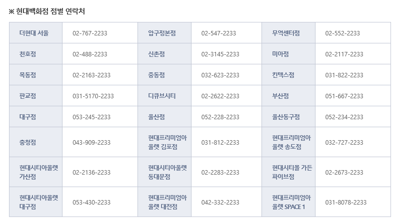 ※ 현대백화점 점별 연락처