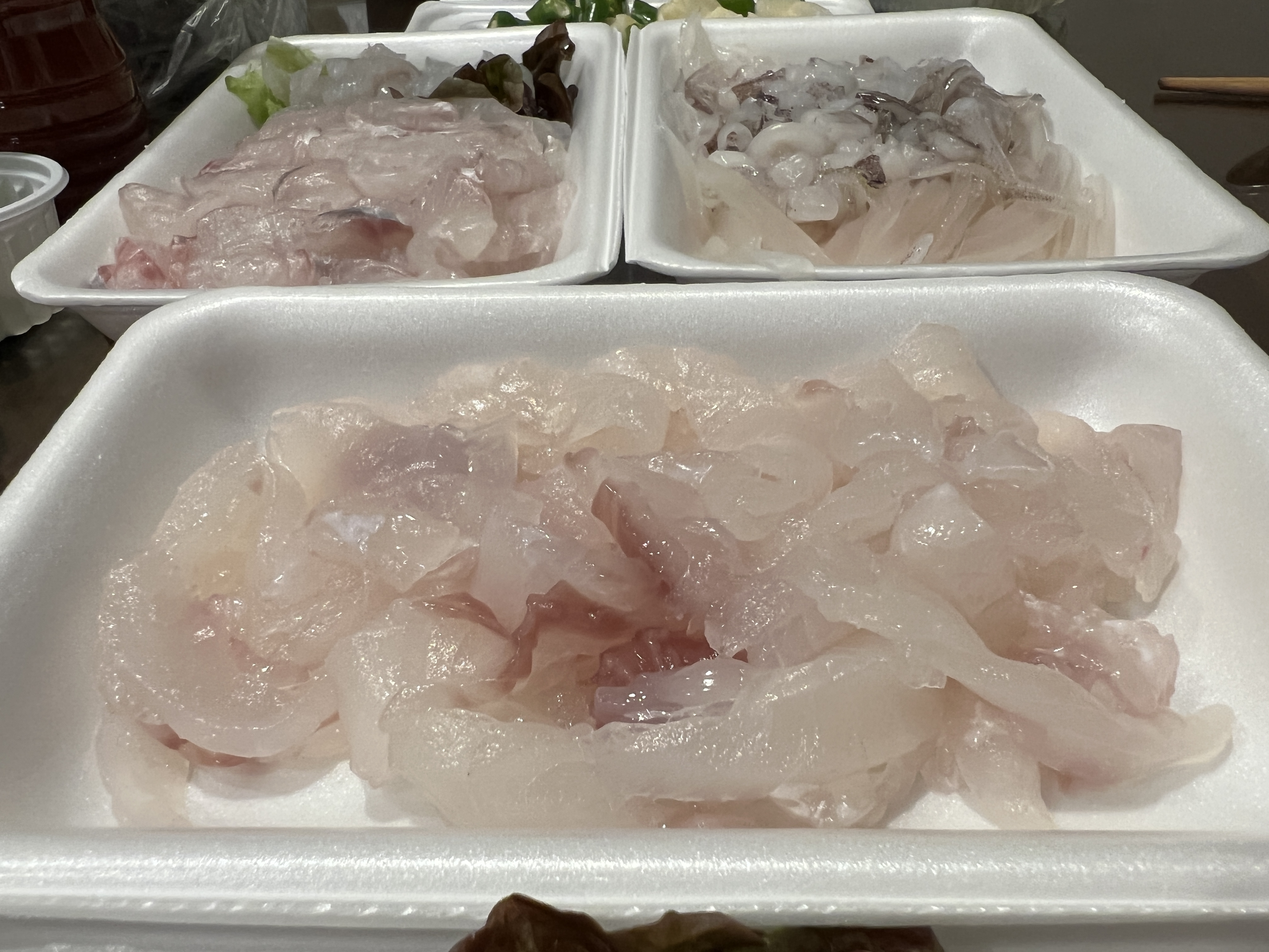 놀래미랑 멍게는 서비스 쥐치 2만원, 성대 2만원 오징어 1만원 이렇게 해서 모둠회 5만원으로 맞췄어요.