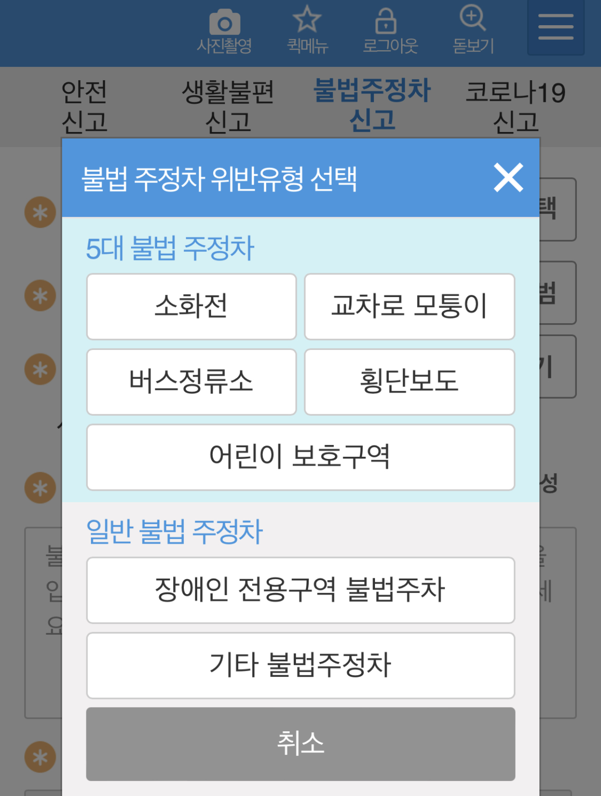 클릭을 하시면 5대 불법 주정차 소화전, 교차로 모통이, 버스정류소, 횡단보도, 어린이 보호구역 이렇게 나오고 일반 불법 주정차 항목에 장애인 전용구역 불법주차, 기타 불법주정차 이렇게 나오는데 기타 불법주정차를 클릭 하시면 되요.