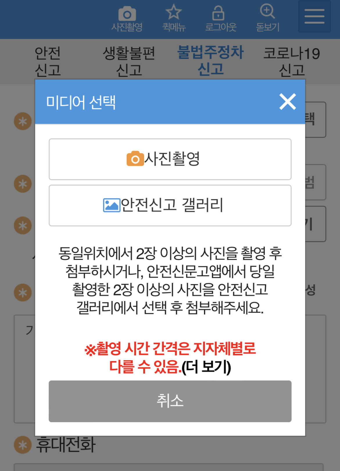사진촬영을 동일한 위치에서 2장 이상 첨부를 해야되요. 사진 촬영을 하시면 촬영한 사진이 안전신고 갤러리에 들어가 있고 2장 이상을 선택 하시면 되요. 특히 촬영 시간 간격은 지자체별로 다를 수 있어요.