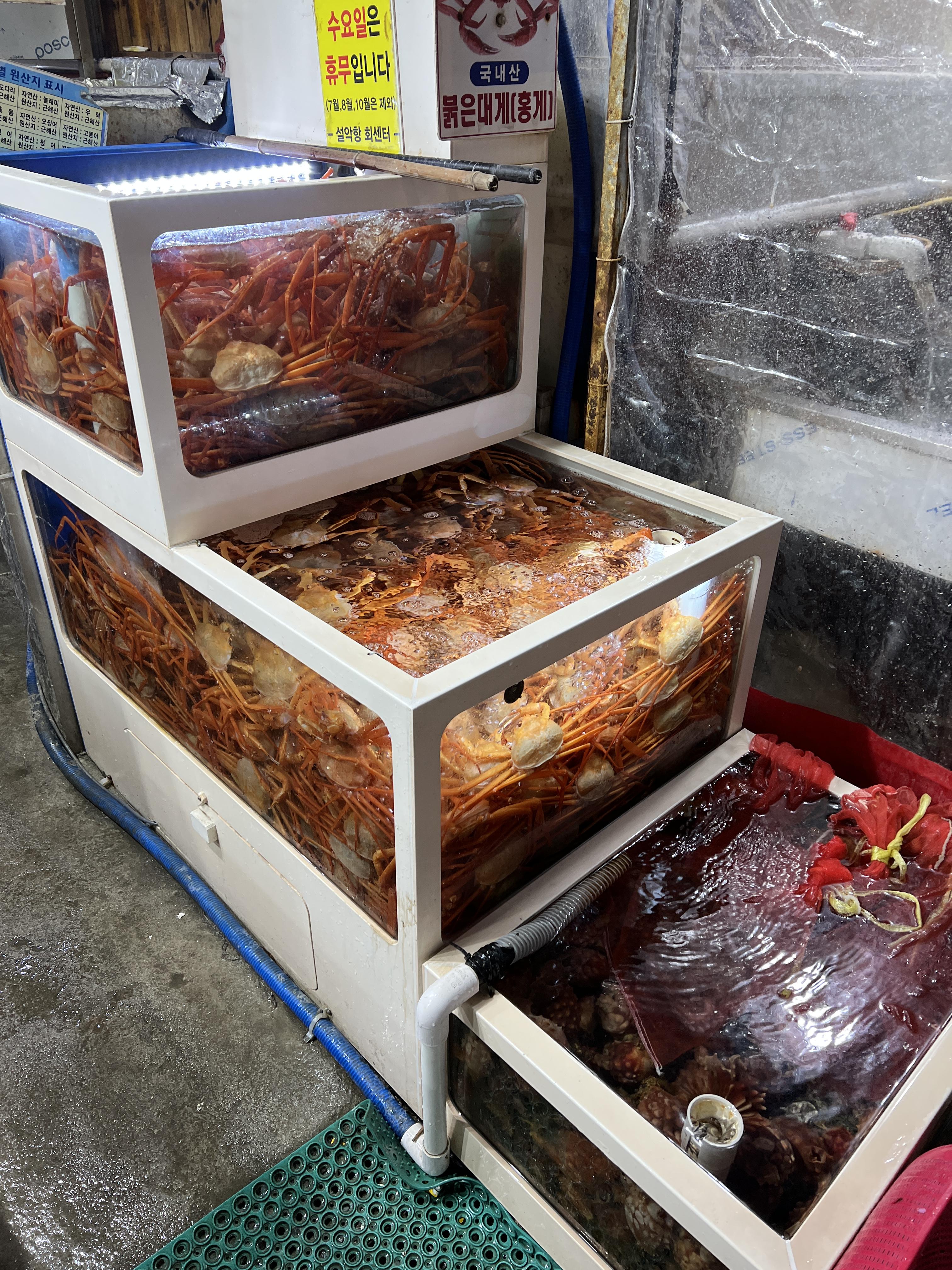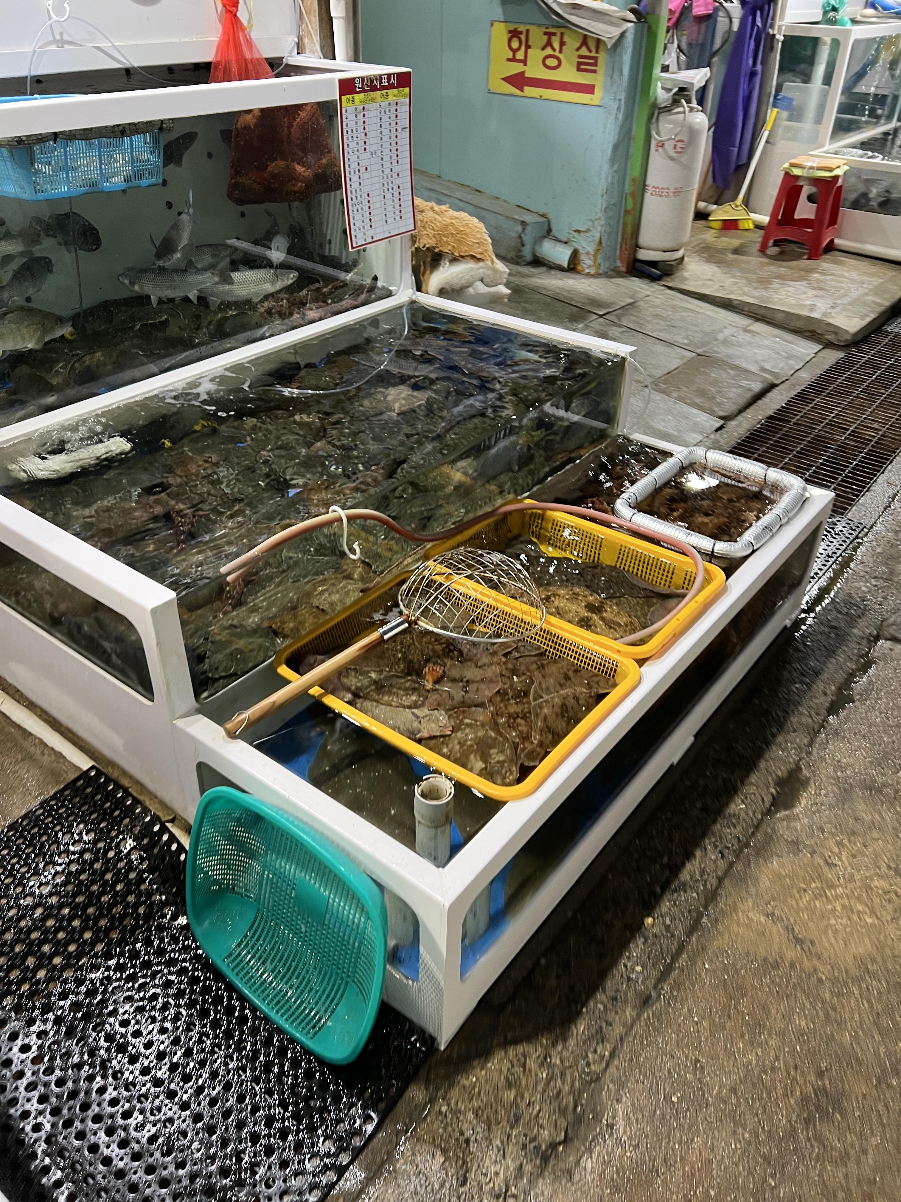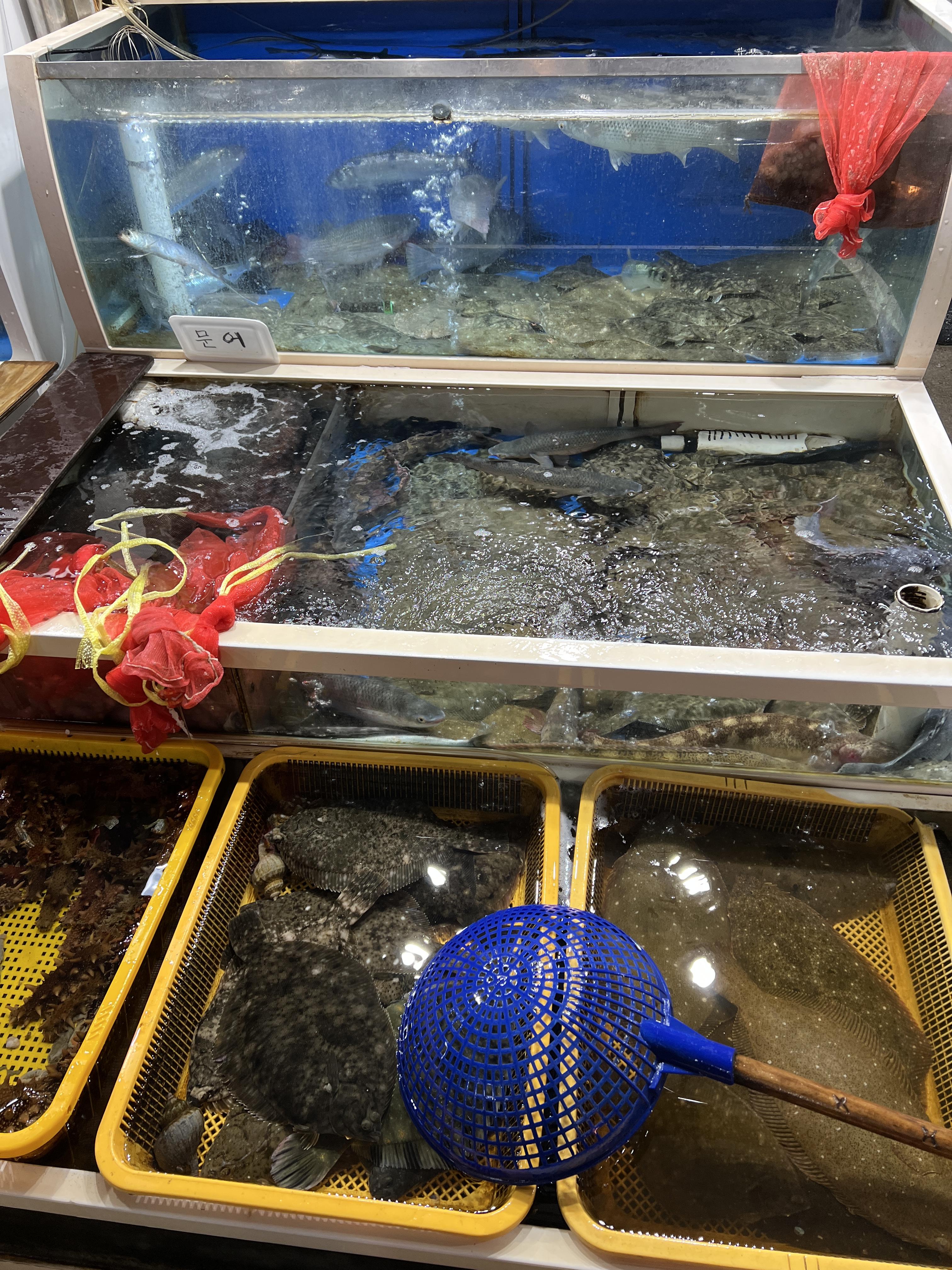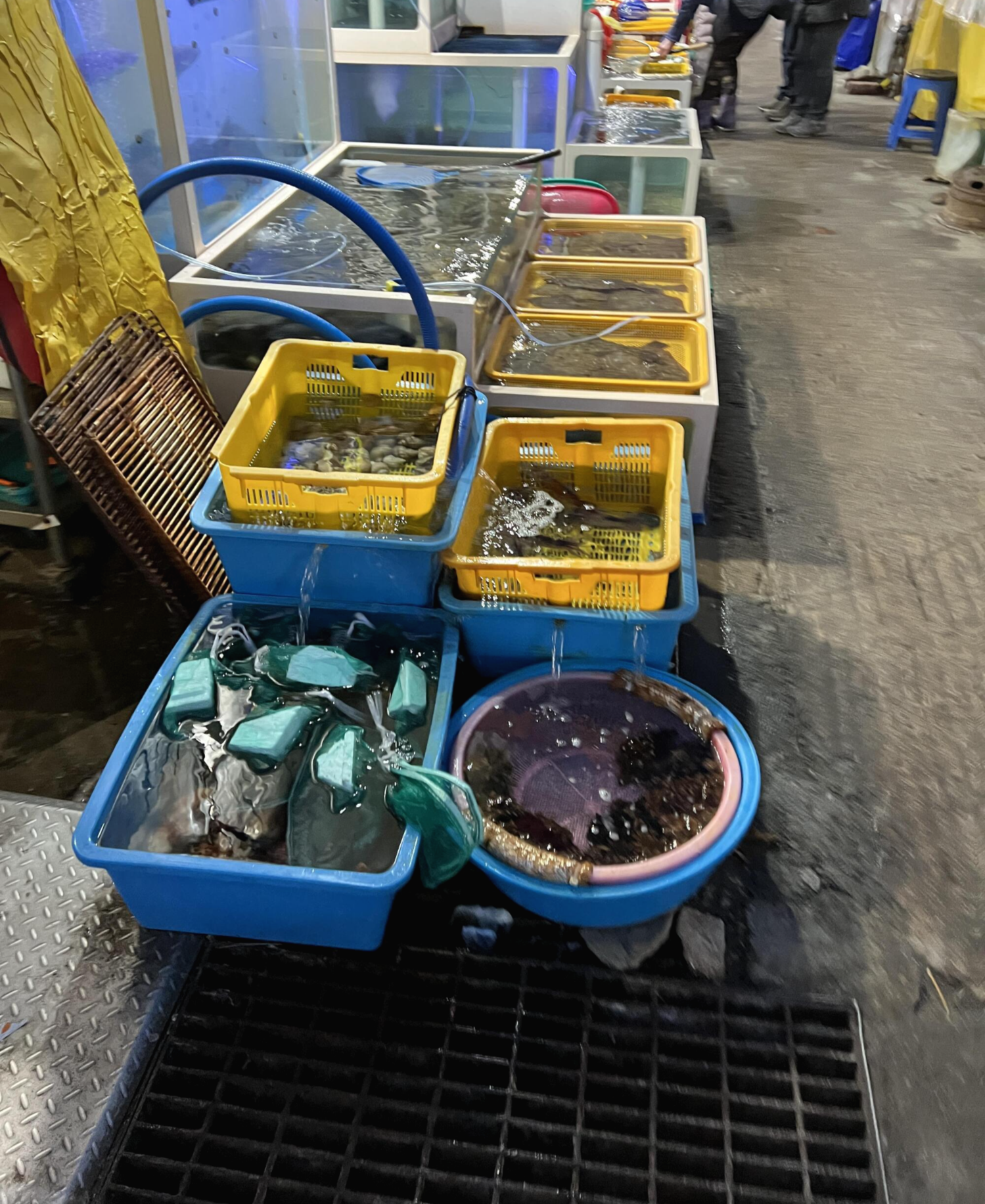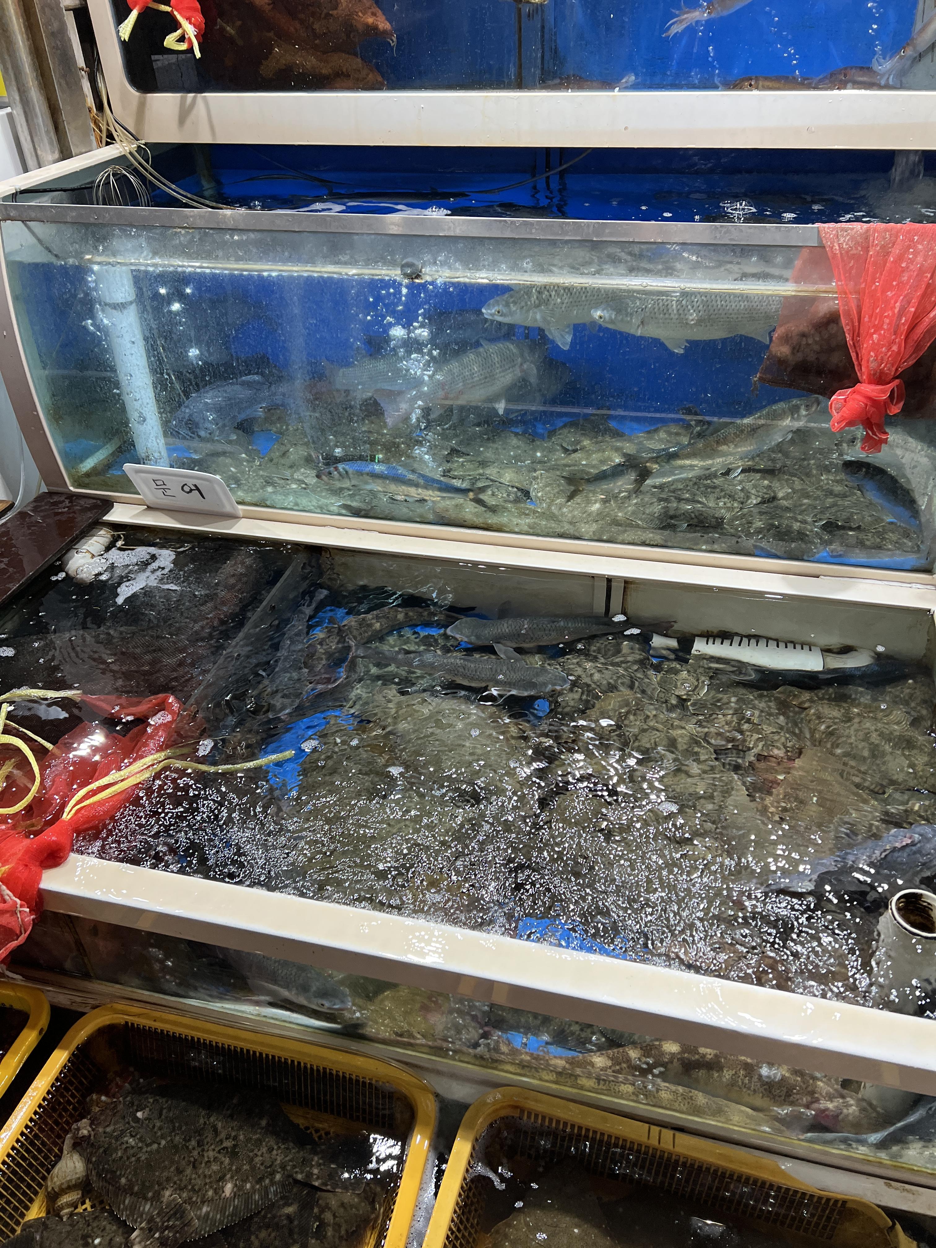 여러군데 돌아다니면서 도다리랑 해서 했는데 생각보다 늦게 가니깐 물고기가 별로 없고 다들 너무 바쁘셔서 아예 흥정 자체가 쉽지 않더라구요. 그나마 몇군데에 이모들이 보여주는데 영 마음에 들지는 않았어요.
