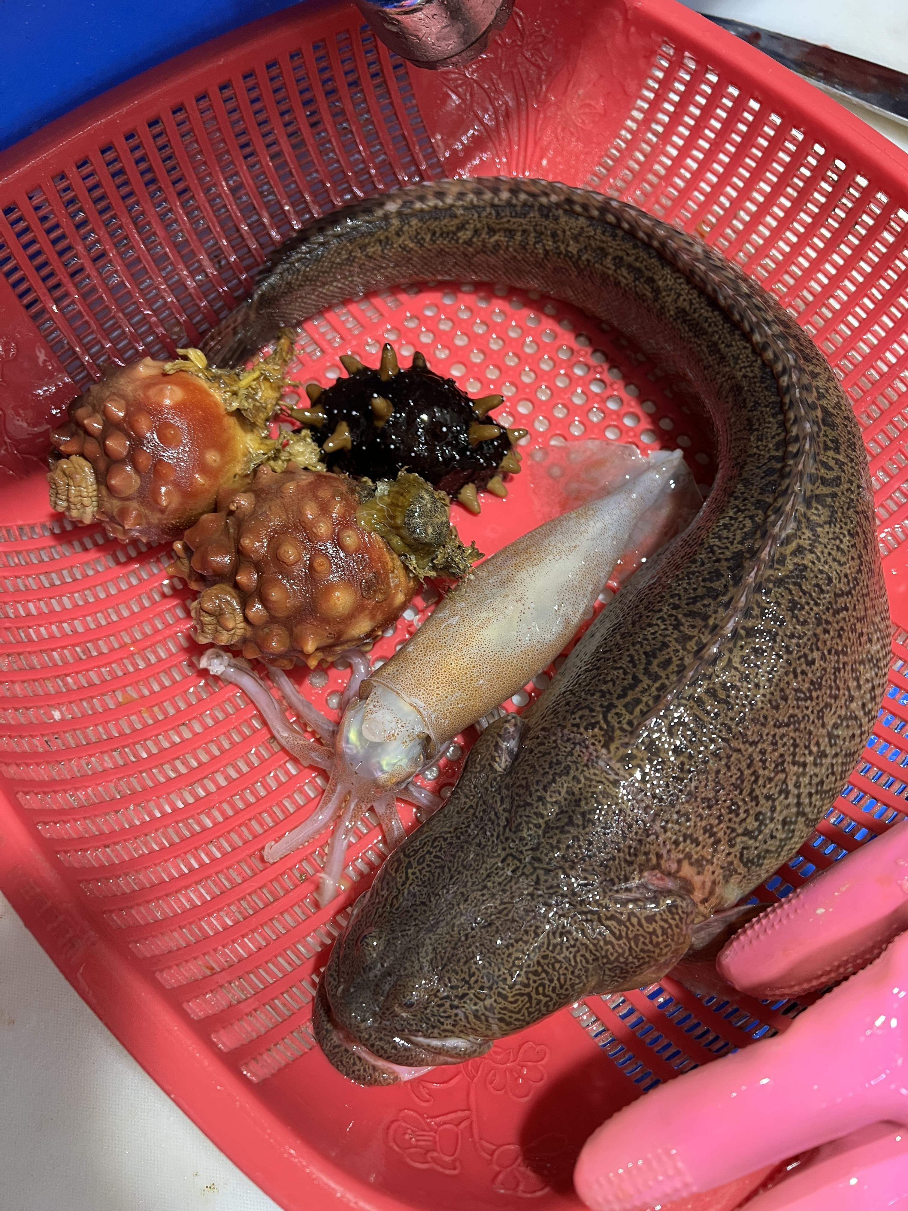 꽃장치라고 해서 매기를 닮은 물고기가 철이라고 보여주는데 저는 먹어본적이 없고 찜이나 조림으로 장치찜, 장치조림, 들어 본적이 있는 물고기 재철이라고 먹어보라고 하더라구요. 계속 고민을 하니깐 돌삼치 1마리랑 해서 꽃장치 1마리 큰놈 오징어 1마리 멍게 2개 해삼 1개 이렇게 해서 6만원을 달라고 하시더라구요.