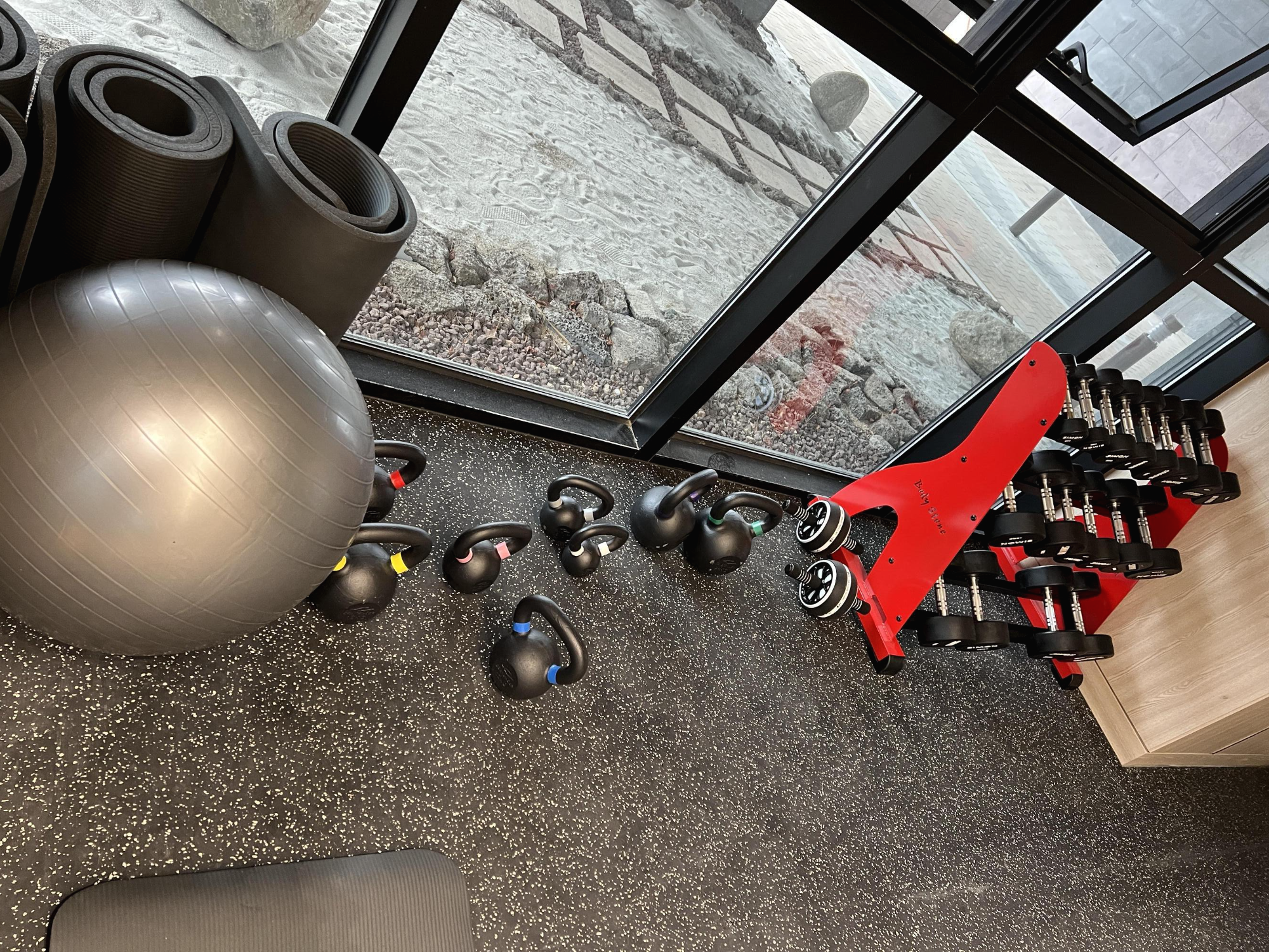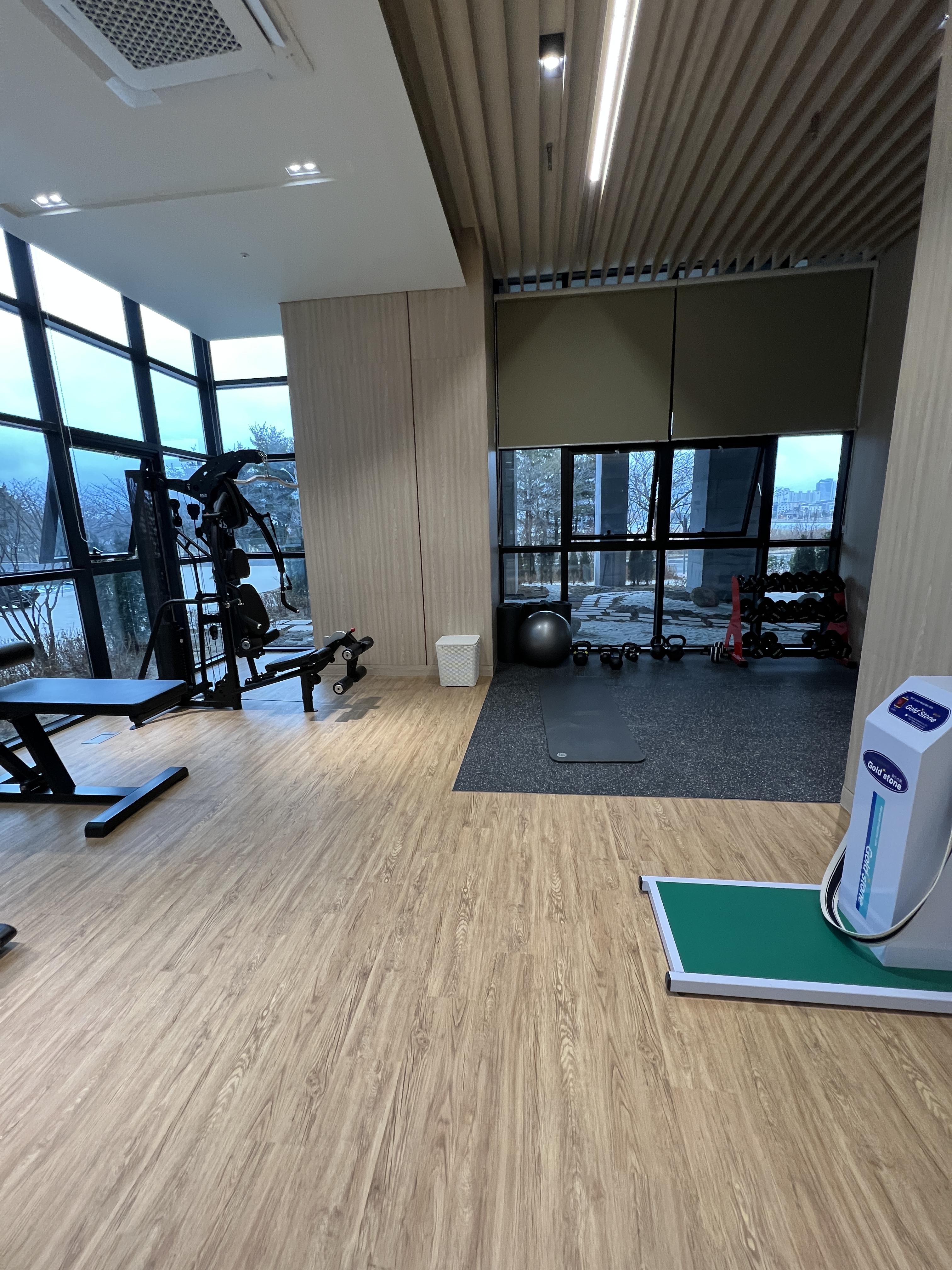 헬스장 운동기구는 런닝머신 2대, 자전거 2대, 가슴운동기구 1개, 덤벨, 아령, 요가매트, 케틀벨 등 기본적으로 헬스에 필요한 부분은 다 가지고 있더라구요. 공간도 생각보다 괜찮고 앞에는 온천 수영장이 보여서 운동하면서 전망도 좋더라구요. 요즘은 호텔이나 리조트 가도 헬스 하시는분은 아침에 런닝머신을 뛴다고 하는데 거기에 딱 맞는 조건 이더라구요.