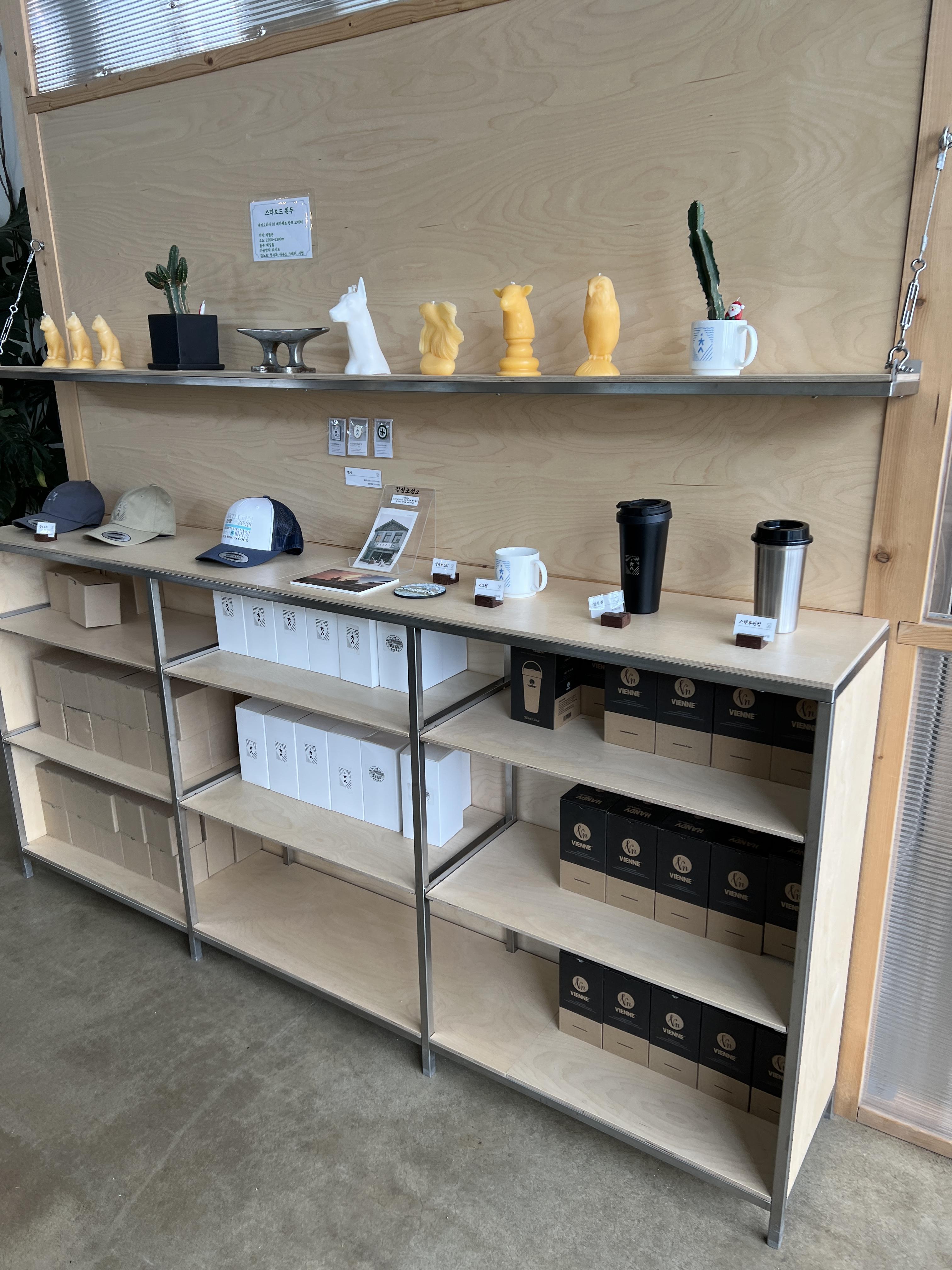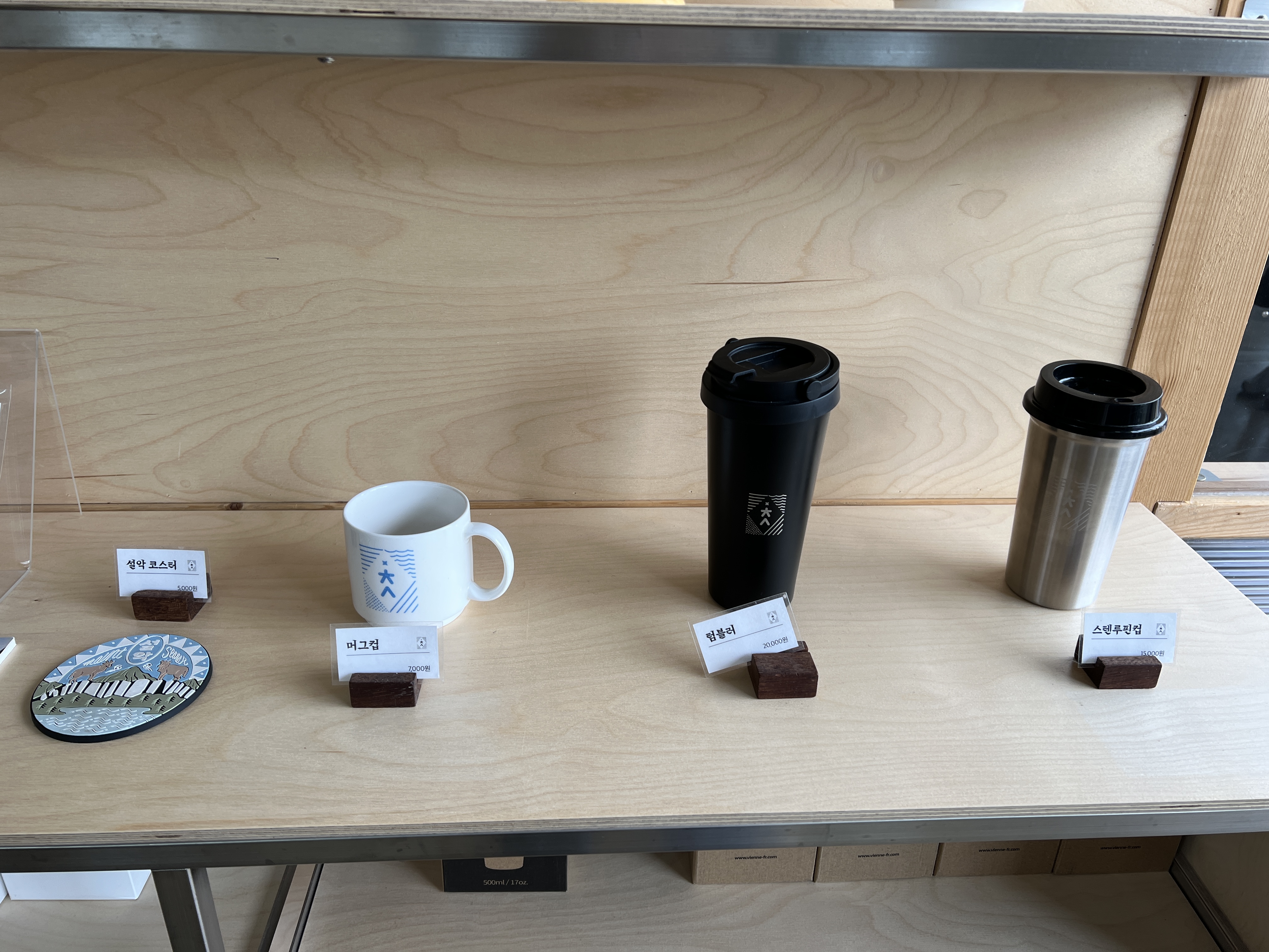 머그컵, 텀블러, 커피원두, 모자 등 다양하게 카페 이미지로 해서 제품이 있더라구요. 또 고양이가 가운데 테이블에 중간에 들어와서 있는데 신기했어요. 강아지도 와서 있고 애견이 동반이 가능한거 같더라구요.