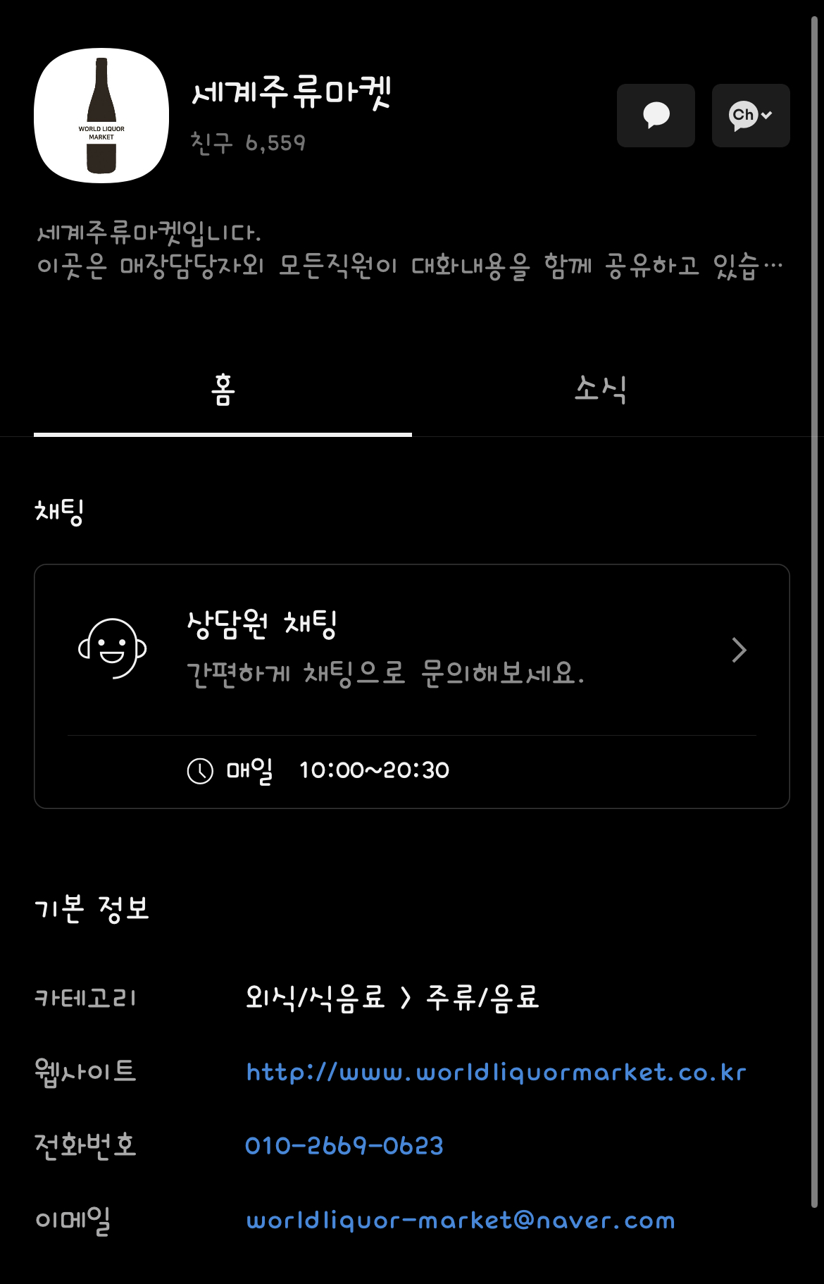 전국에서 제일 큰 술 마켓인 세계주류마켓 방문하기전에 원하시는 제품이 있으면 위에 보이는 카톡으로 문의하시면 답을 주시니깐 참고 해주시고 술 좋아하시는분이라면 서울 양양 고속도로 타고 오시면 춘천ic 바로 옆이라서 닭갈비 먹고 세계주류마켓도 한번 들려 보시는것도 추천드리고 싶네요.