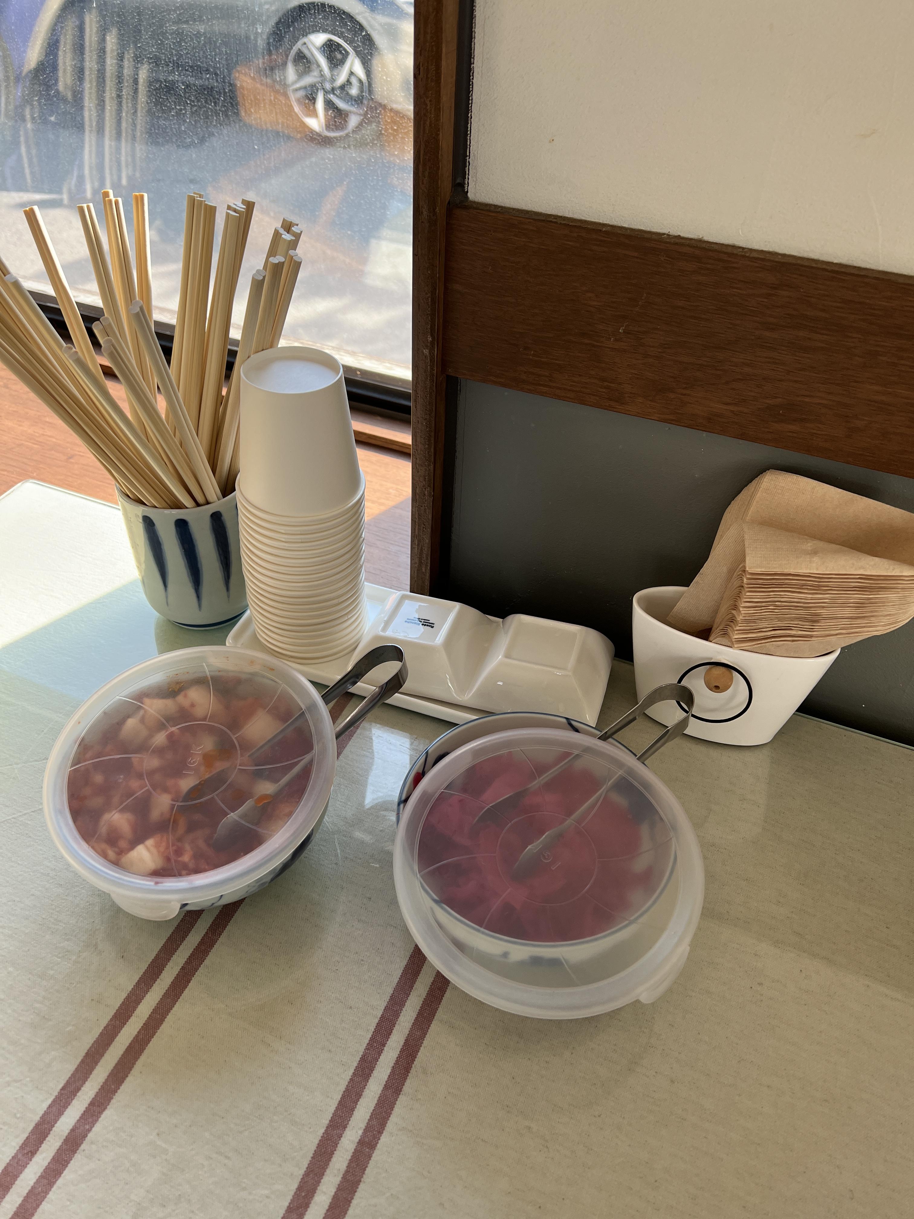 김치랑 초생강은 이렇게 옆에 있어서 먹을만큼 덜어서 드시면 되요. 밑반찬 부족해서 매번 부르는거보다 이렇게 해놓으면 먹기 편하더라구요.