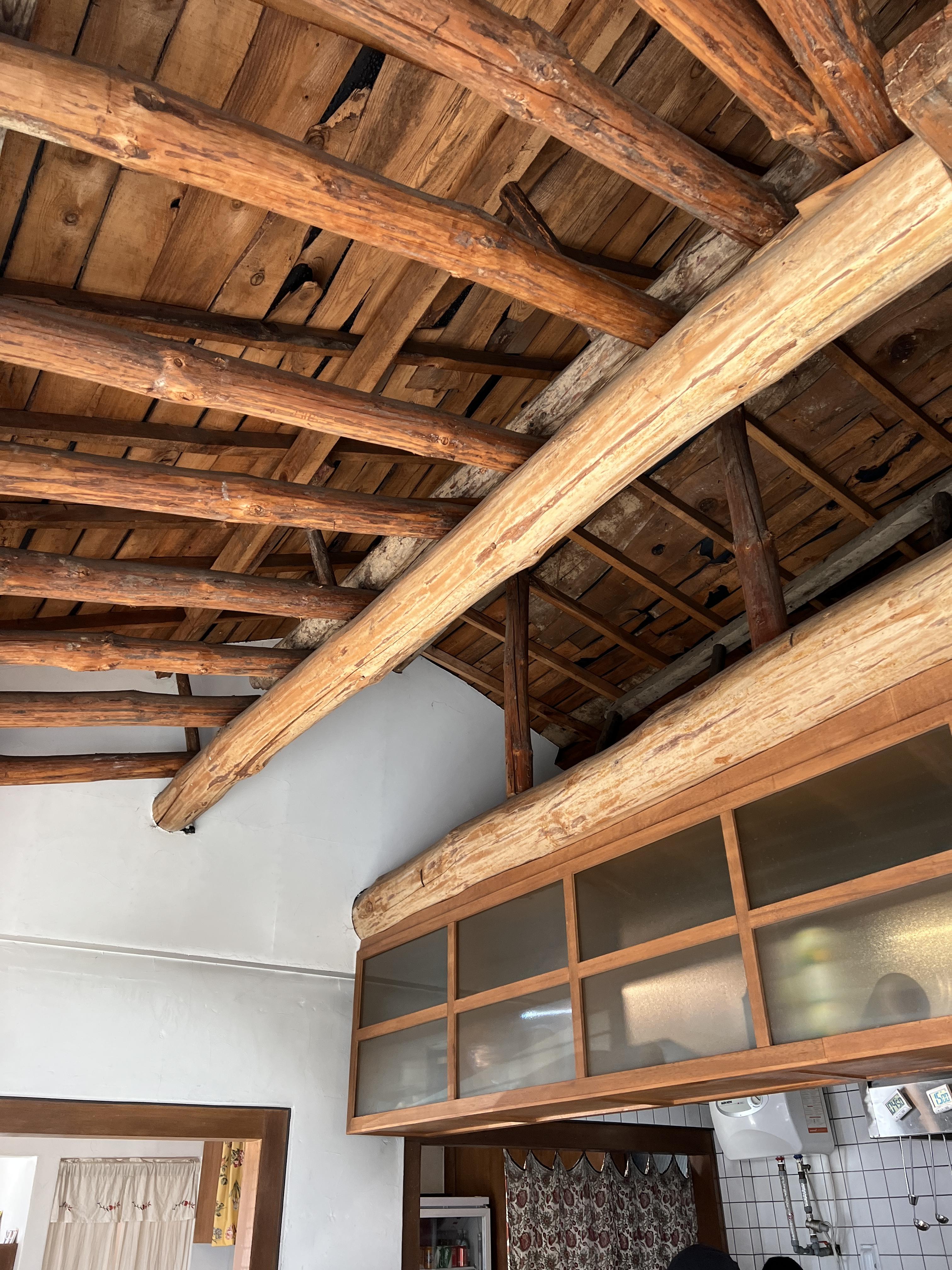 중간에 주방이 있고 주방앞 닷지 좌석이랑 양쪽으로 테이블 자리들이 있고 아기자기하게 깔끔하게 꾸며 놨고 위를 보니깐 지붕은 옛날 그대로 석가래도 살려놔서 엄청 고풍지더라구요.