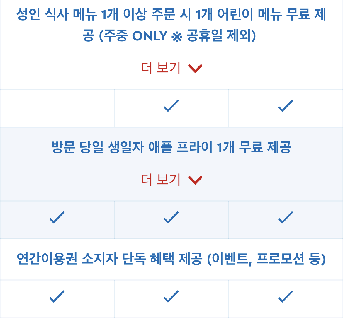 | 성인 식사 메뉴 1개 이상 주문 시 1개 어린이 메뉴 무료 제공 (주중 ONLY ※ 공휴일 제외) | X | O | O |