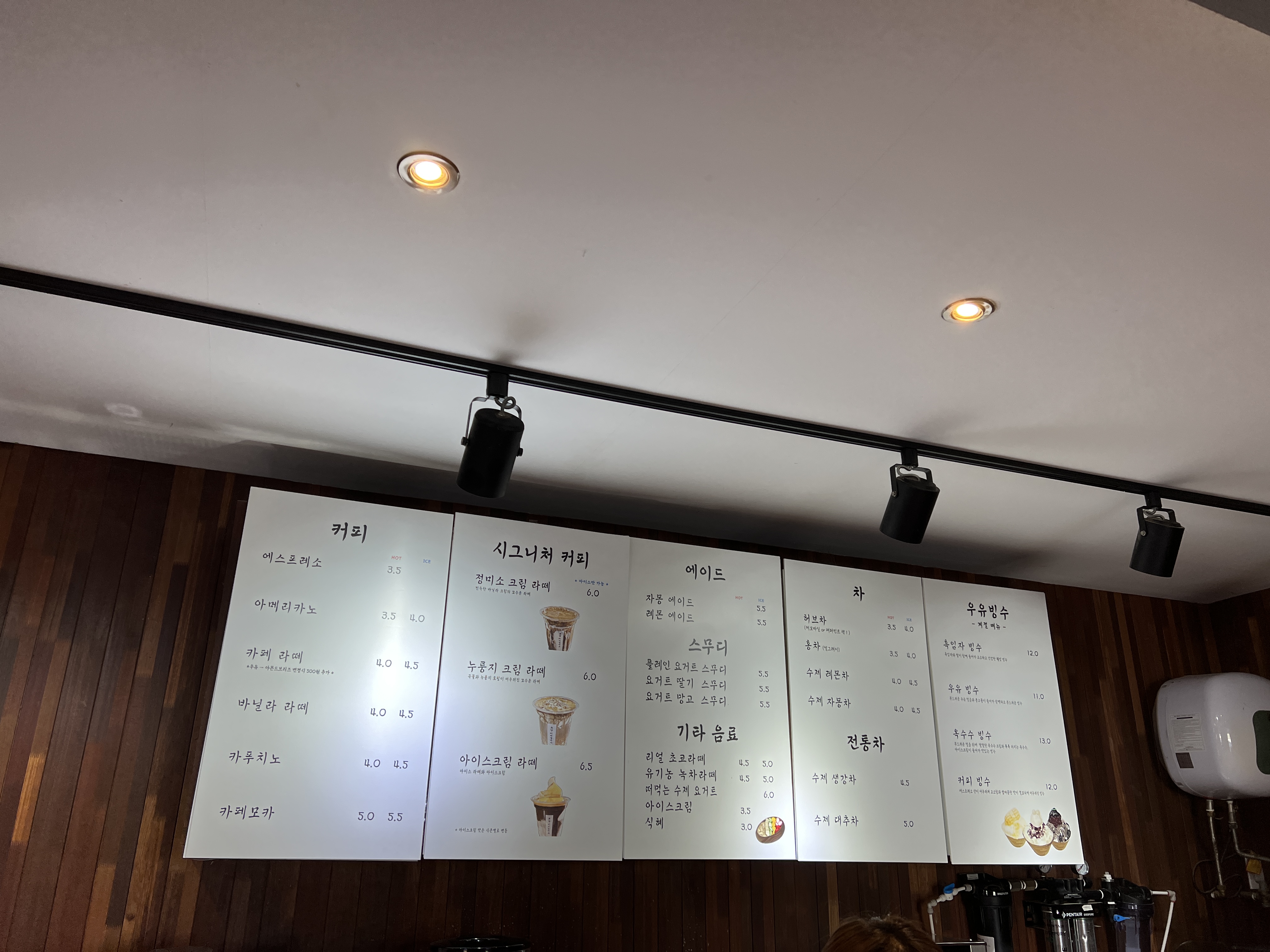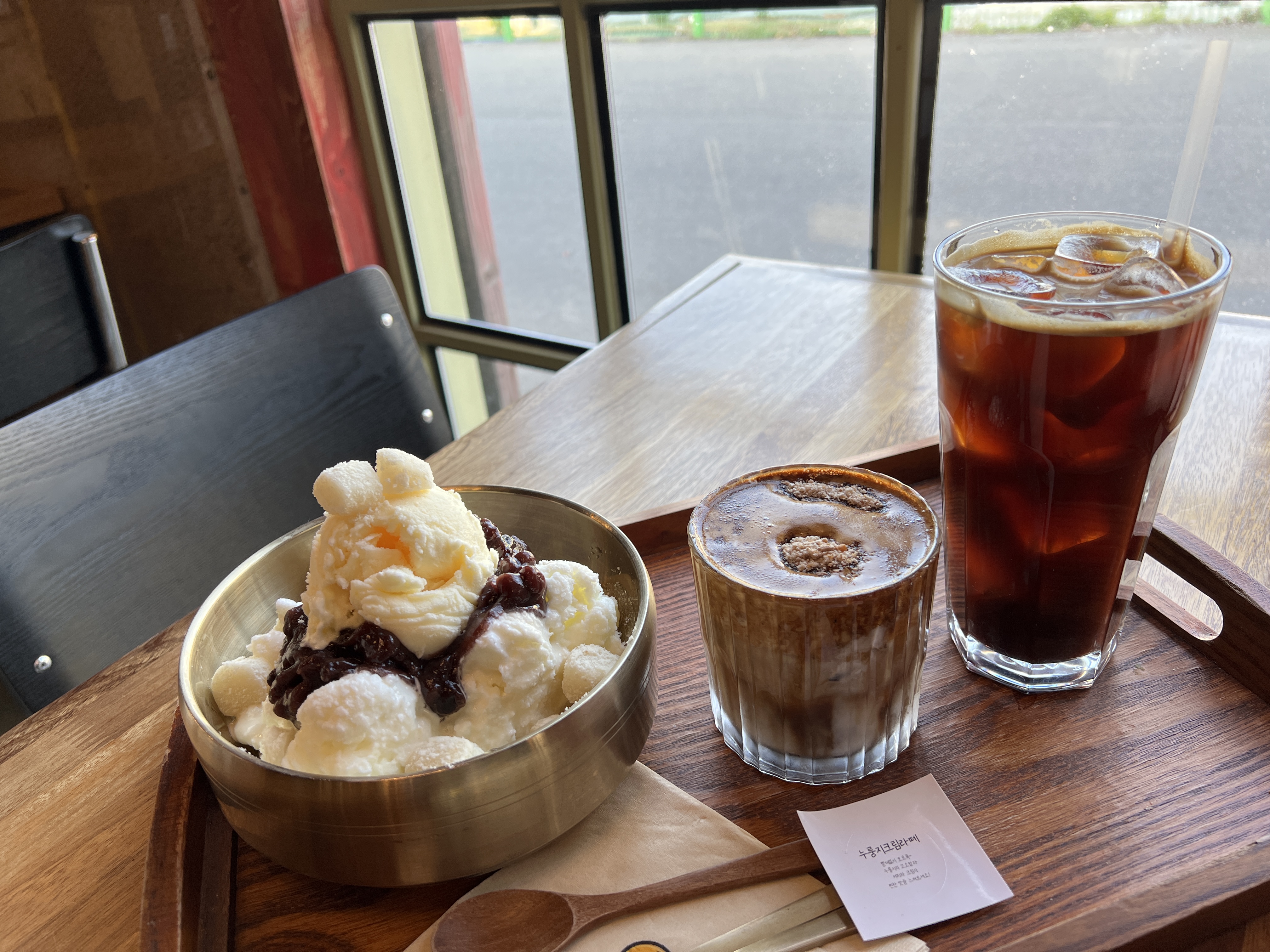 어떤걸 먹을까 하다가 저는 커피집에 오면 항상 아메리카노를 꼭 먹어봐서 아아 한잔이랑 여기 대표 메뉴 누룽지 크림 라떼 그리고 우유 빙수 이렇게 주문 했어요.