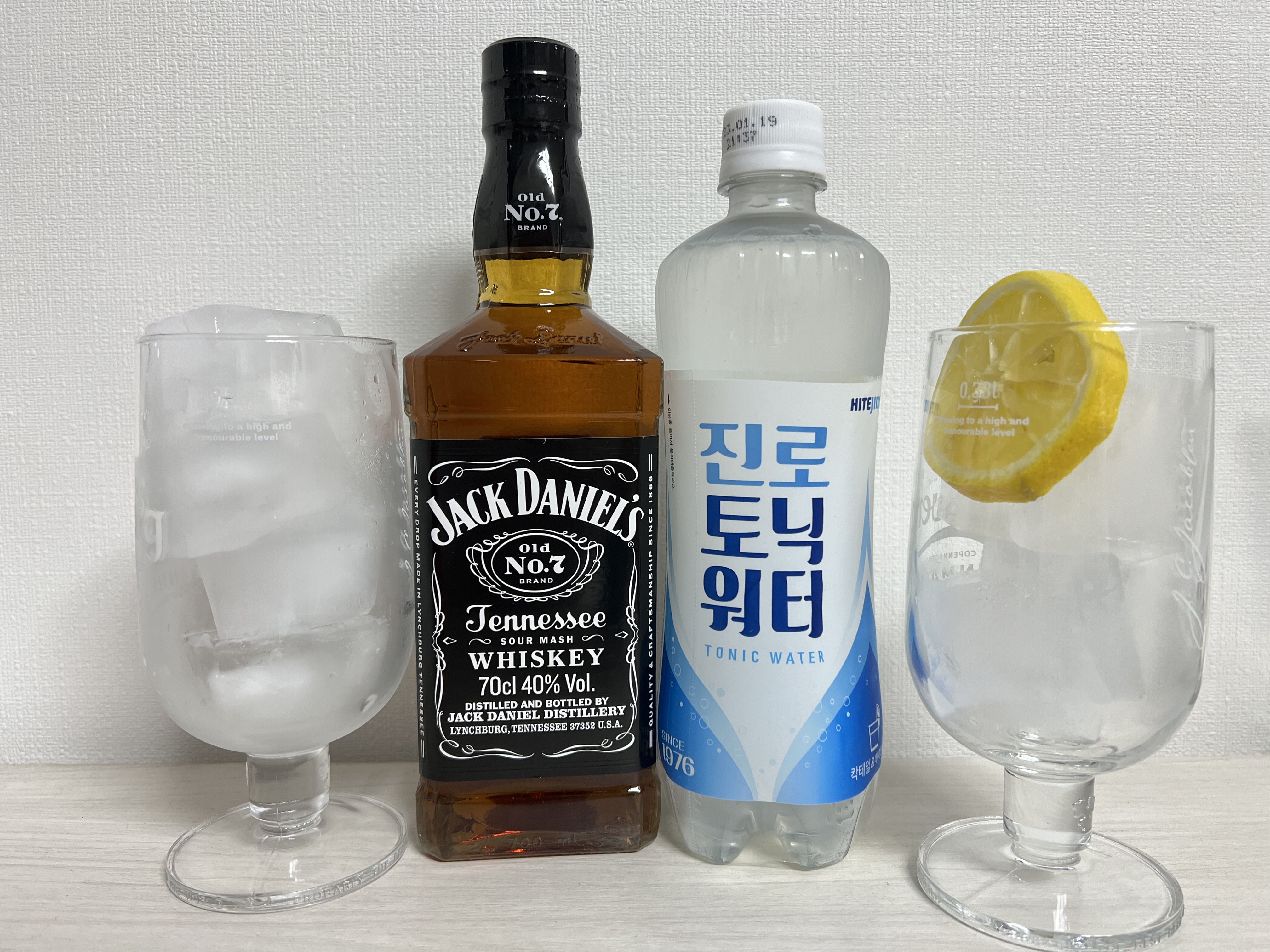 준비물은 얼음, 레몬, 진로토닉워터, 잭다니엘 이렇게 준비하시면 되요.