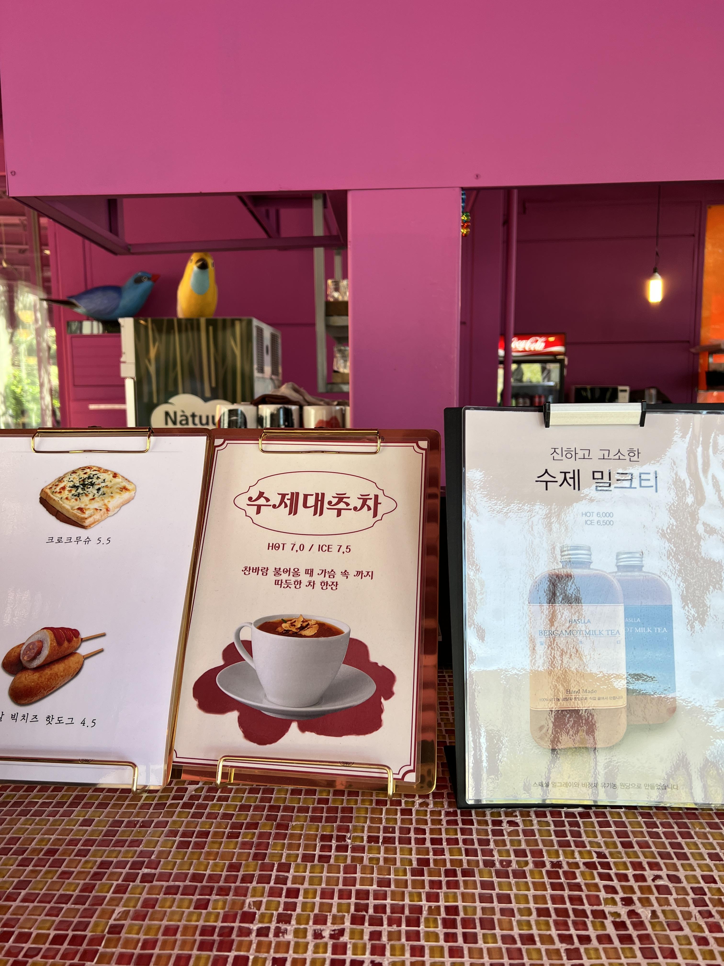 메리카노는 아이스가 오천오백원정도 해요. 더치커피도 있고 차종류, 스무디, 밀크티, 에이드 다양하게 있어요.