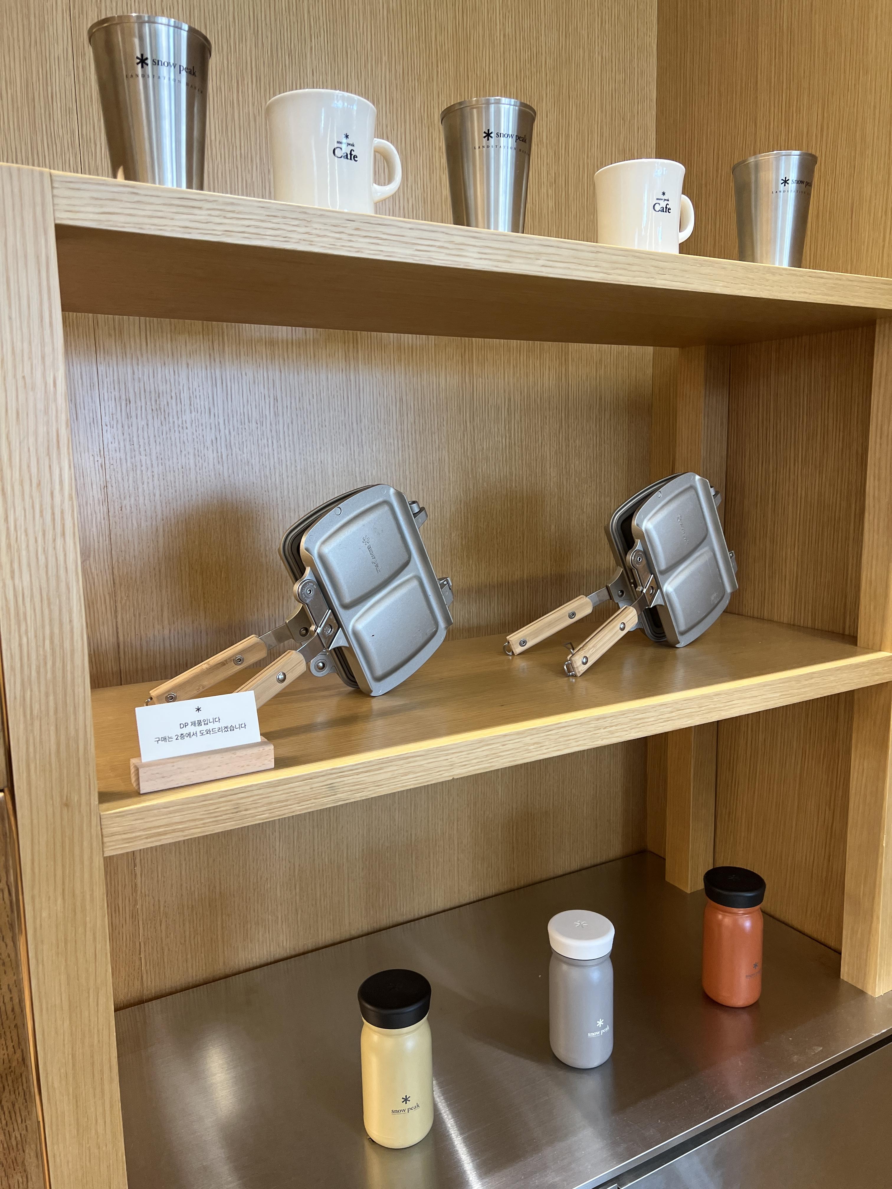 스노우피크 텀블러와 머그, 트라메지노 샌드위치 쿠커가 전시 되어 있어요.