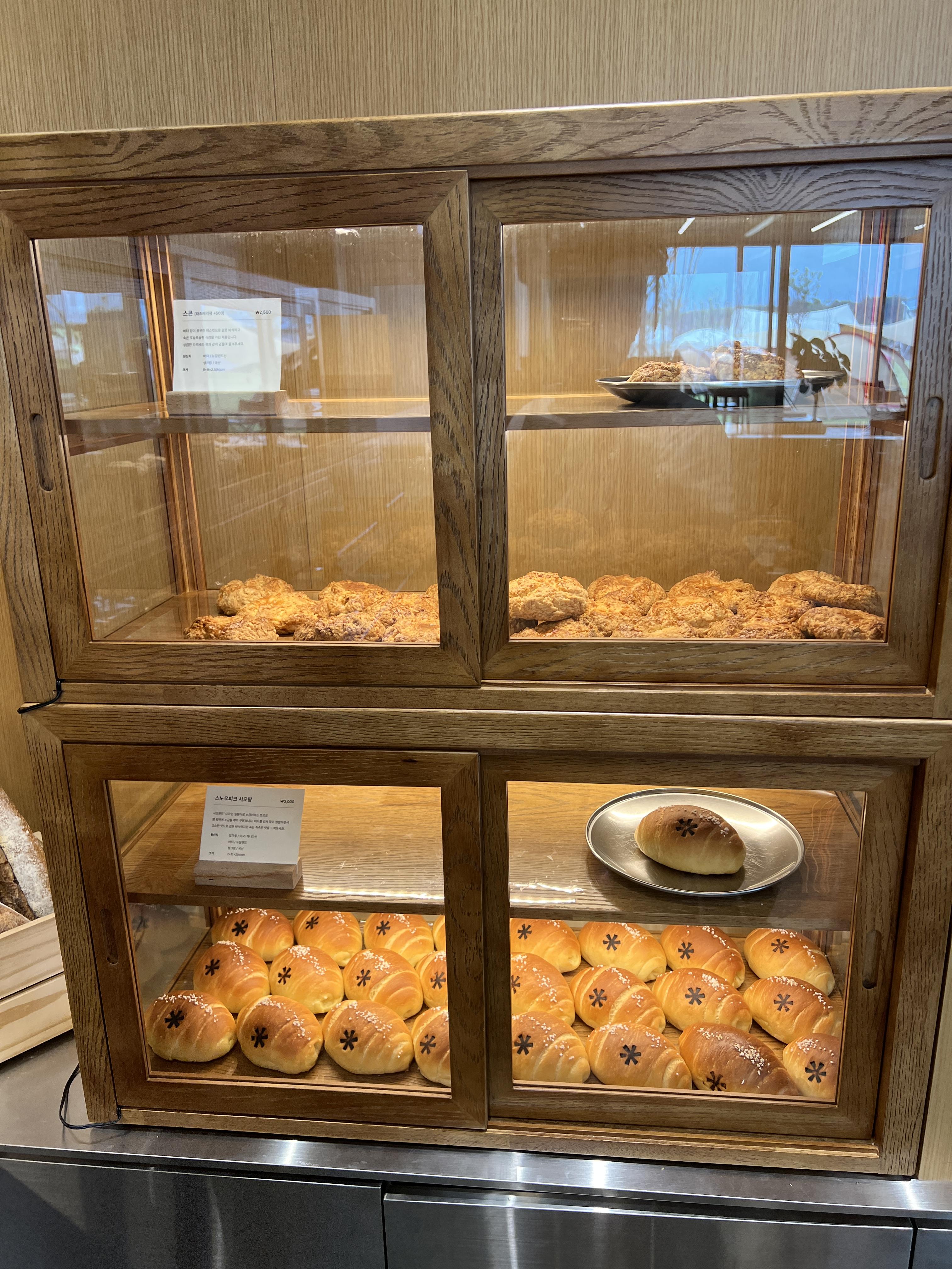 빵종류는 다양하게 있고 크러핀 설봉 초코딸기, 크랜베리 호두 깜빠뉴, 스노우피크 데니쉬 식빵, 스노우 크루아상, 스노우피크 시오팡, 스콘, 크루아상, 하프 바게트 등 이렇게 종류가 있더라구요.