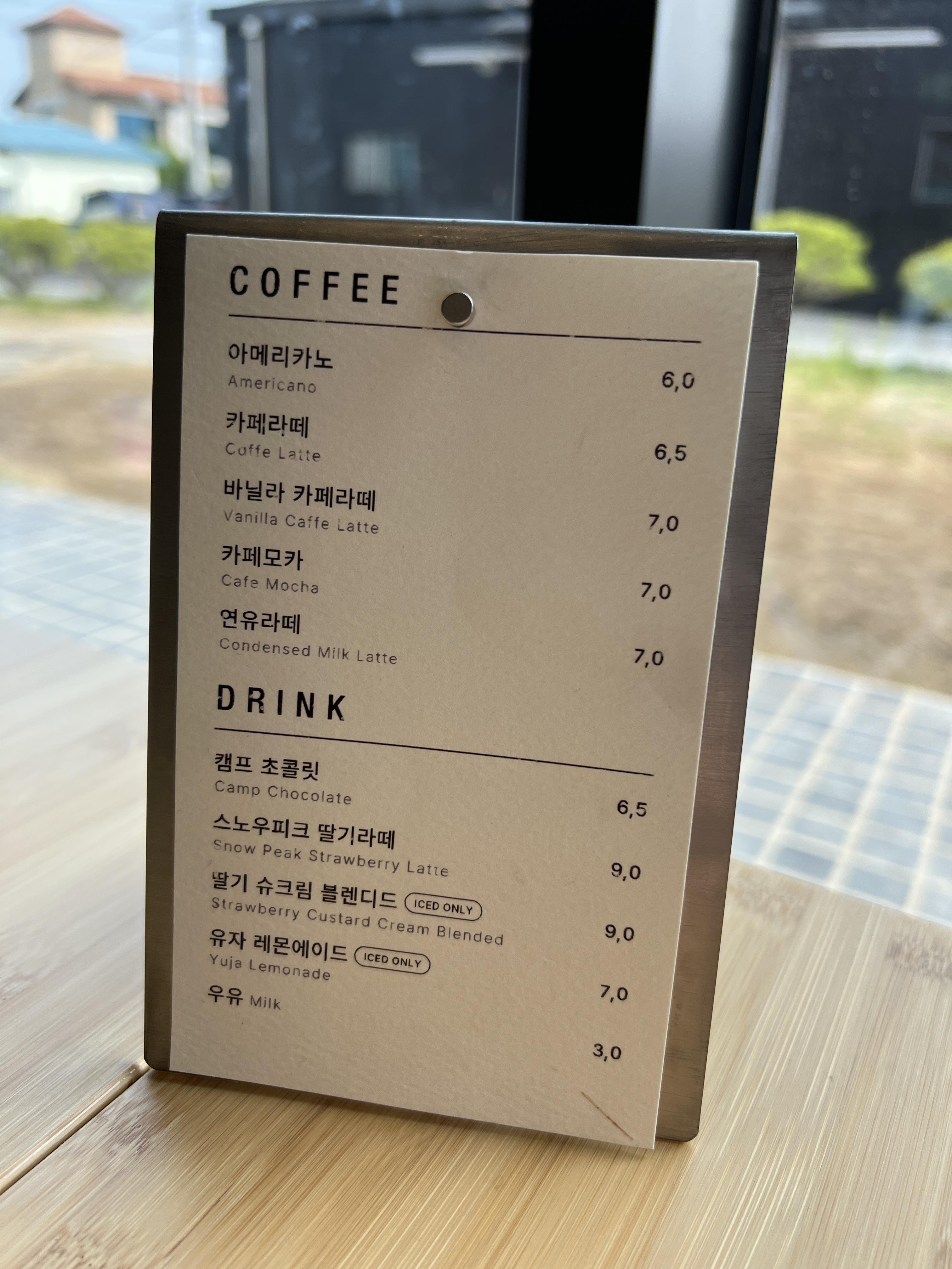 테이블 위에도 이렇게 간단히 음료 메뉴판도 있고 스노우피크 매장은 친환경 매장으로 운영되는 카페라서 빨대와 일회용 컵은 제공 되지 않는다고 명시 해놨더라구요.