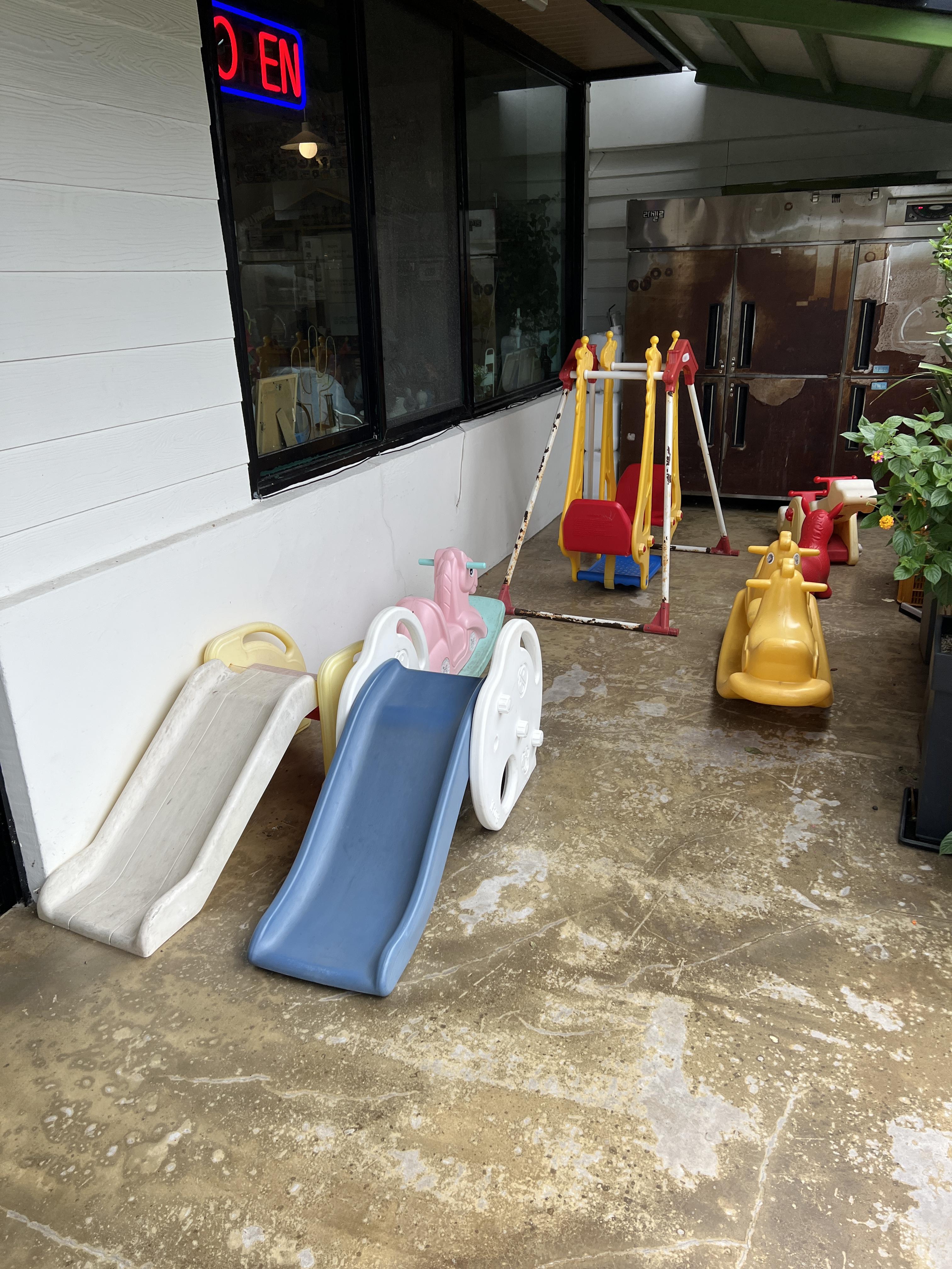 대기는 테이블링 해서 카카오톡으로 받으면 되서 차에서 기다리는 구조로 하면 되고 앞에 대기석이랑 유아들이 놀 수 있는 살짝에 놀잇감들이 있어요.