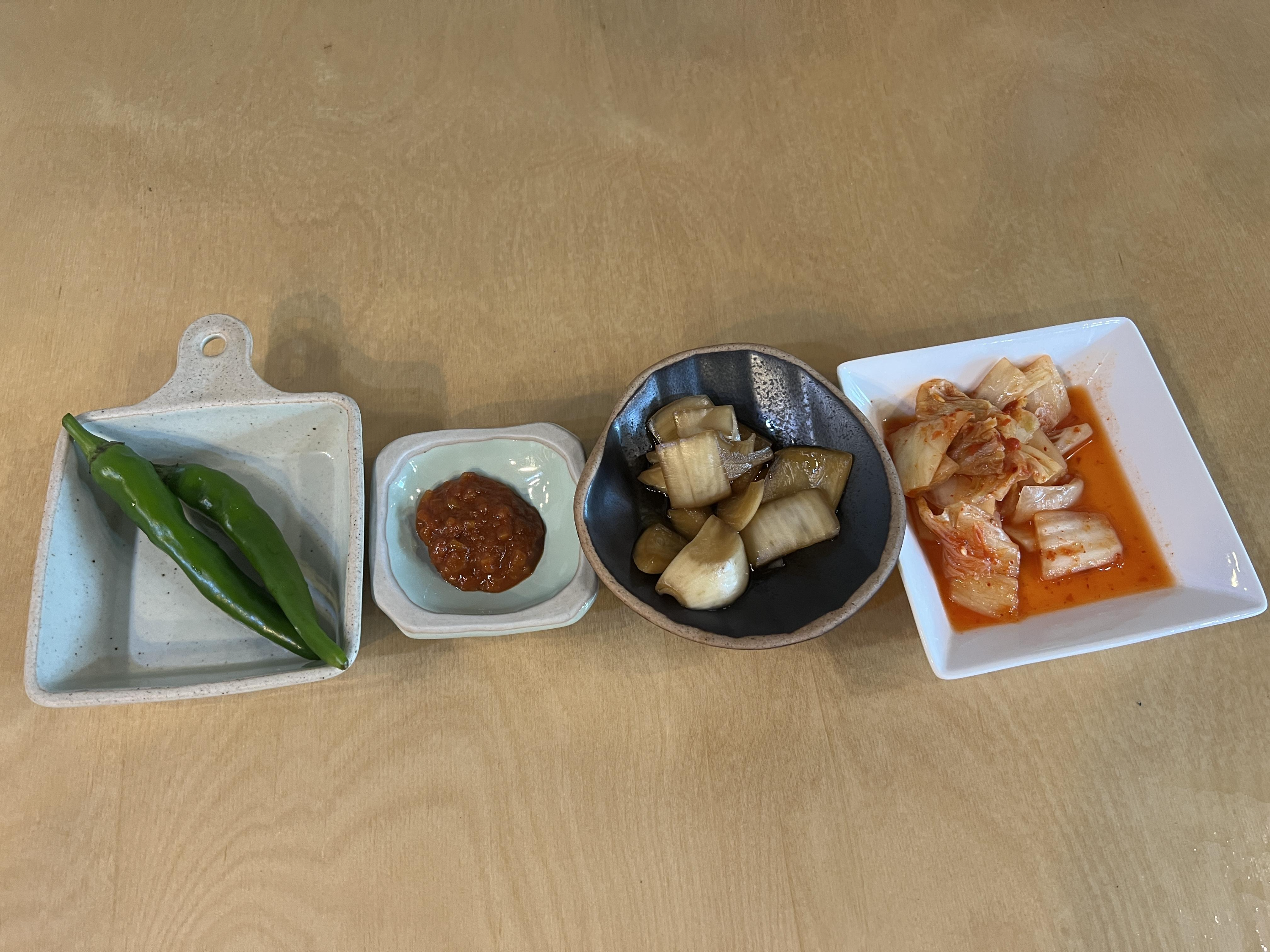 기본 반찬은 고추, 쌈장, 양파절임, 김치 이렇게 나와요.