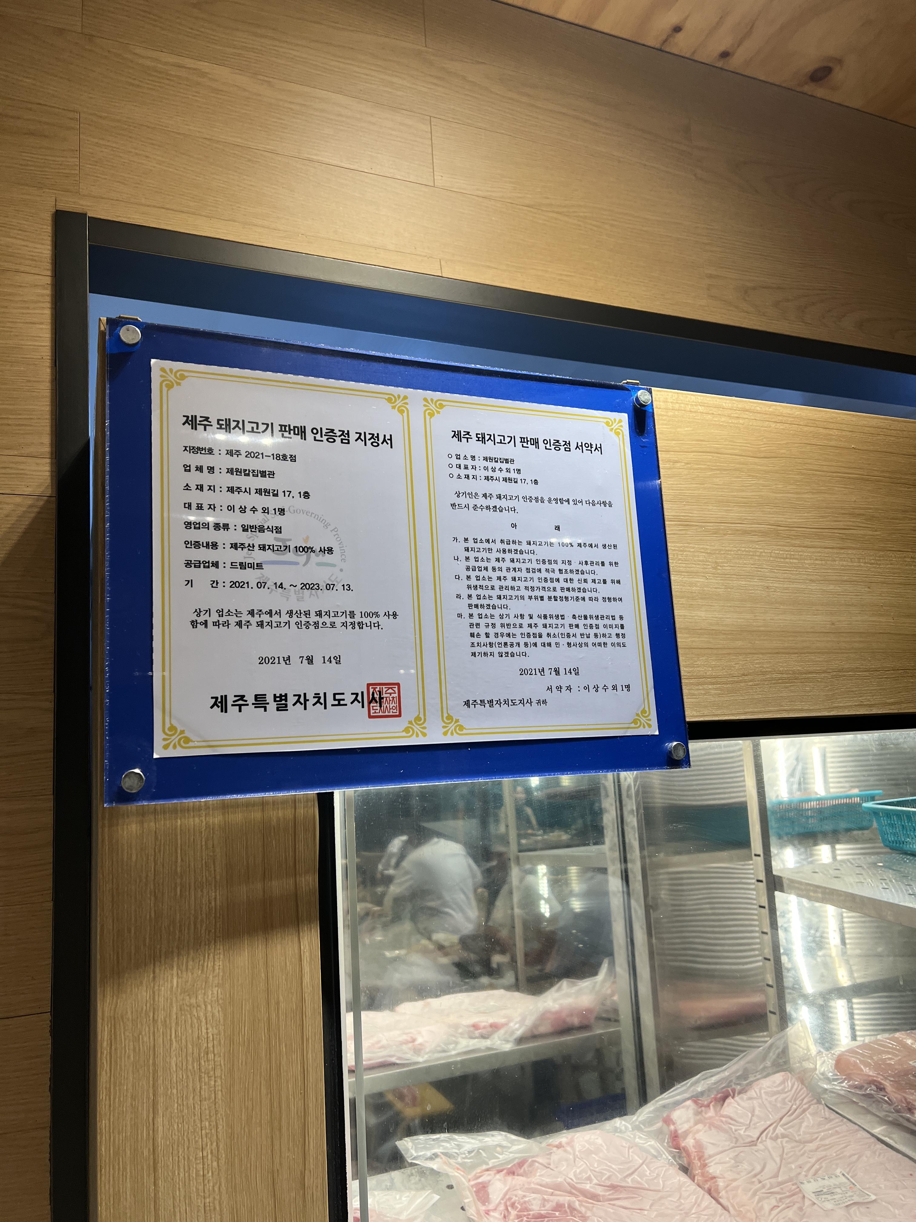 제주 돼지고기 판매 인증점 이라고 해서 서약서가 있어서 더 믿음직스럽더라구요.