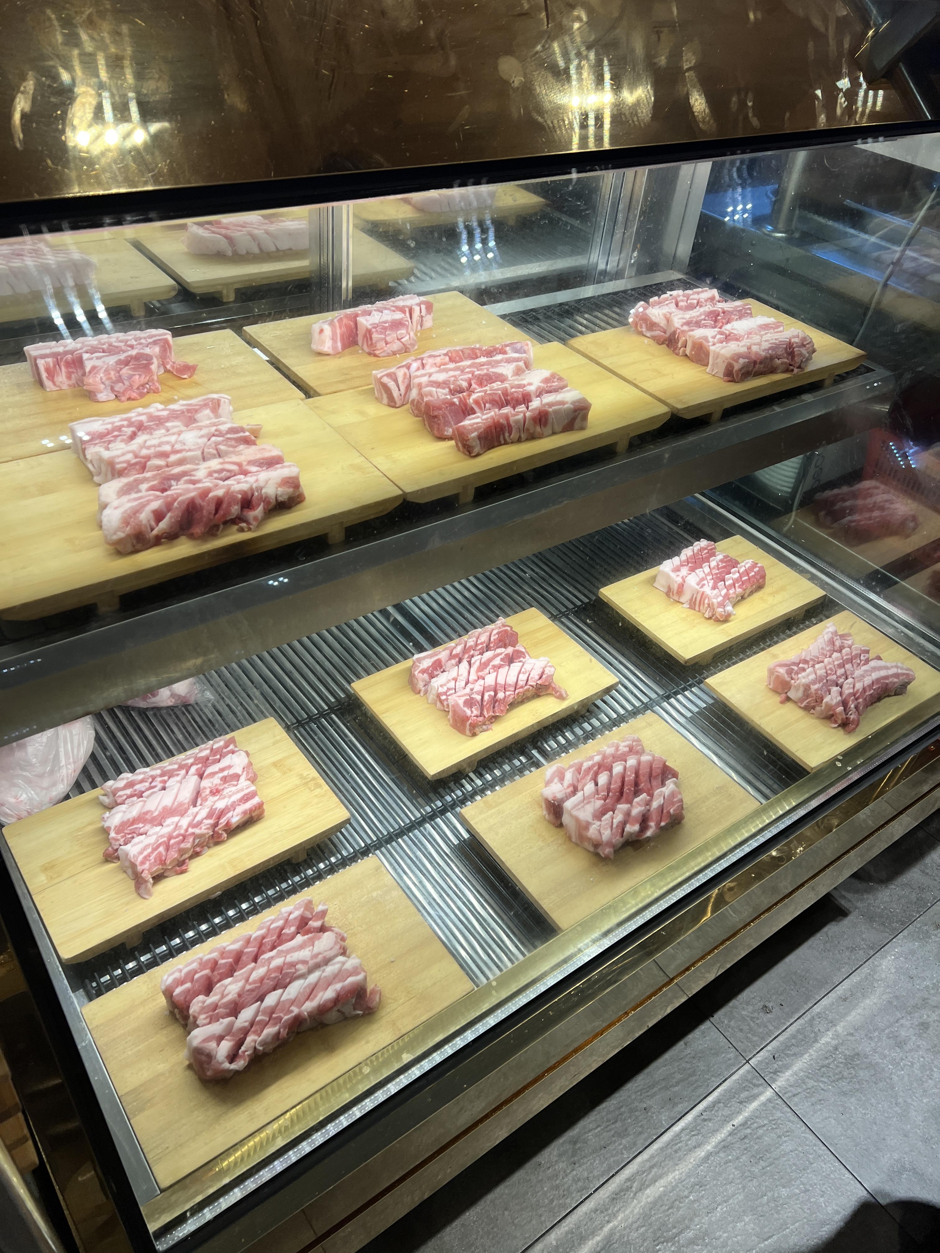 메뉴는 칼집삼겹살이 주메뉴이고 흑돼지 오겹살과 일반 차이가 이렇게 있어요. 특수부위 중엔 흑돼지 가브리살이랑 항정살도 팔아요.