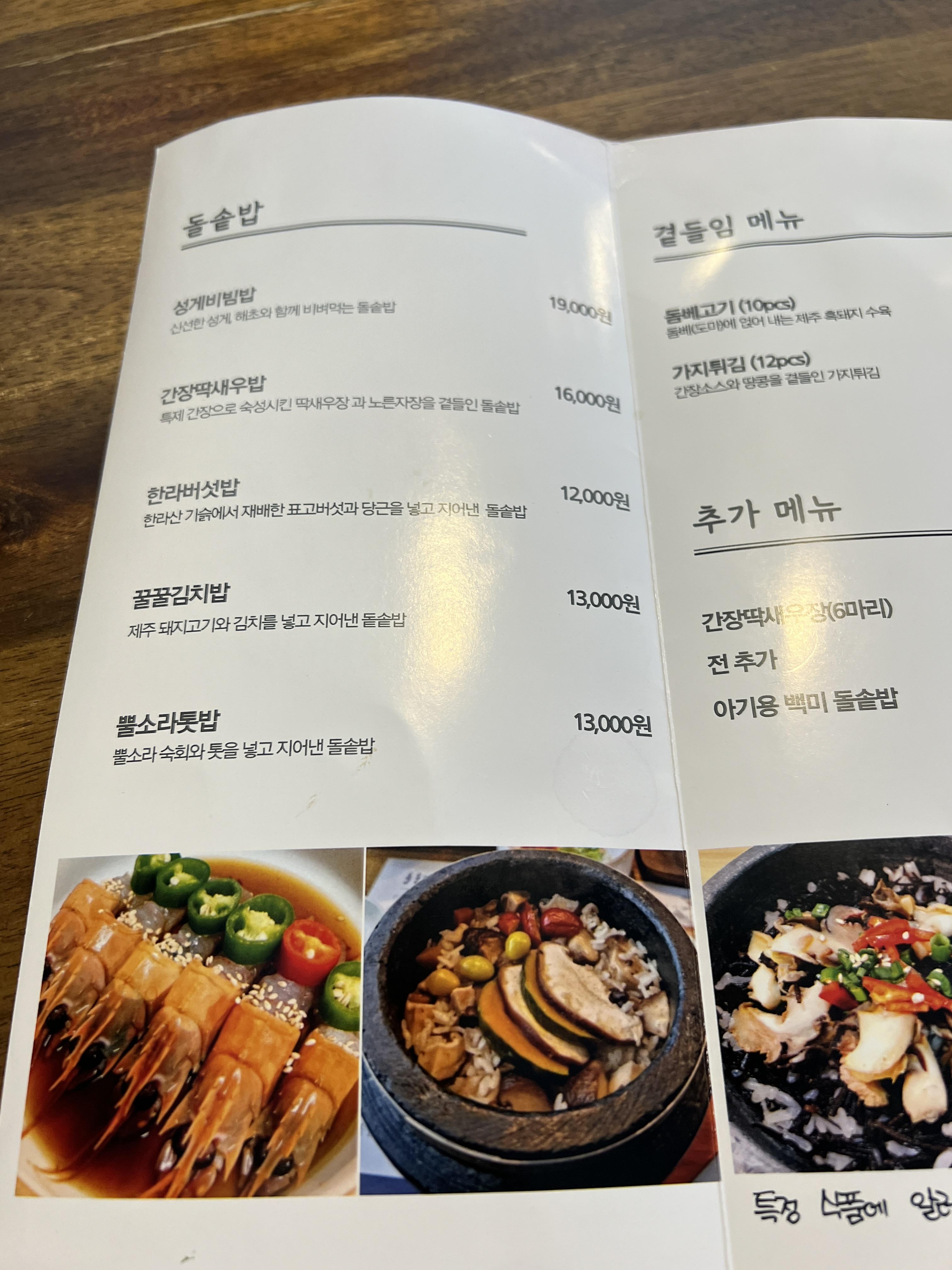 성게비빔밥, 간장딱새우밥, 한라버섯밥, 꿀꿀김치밥, 뿔소라톳밥 이렇게 있어요.