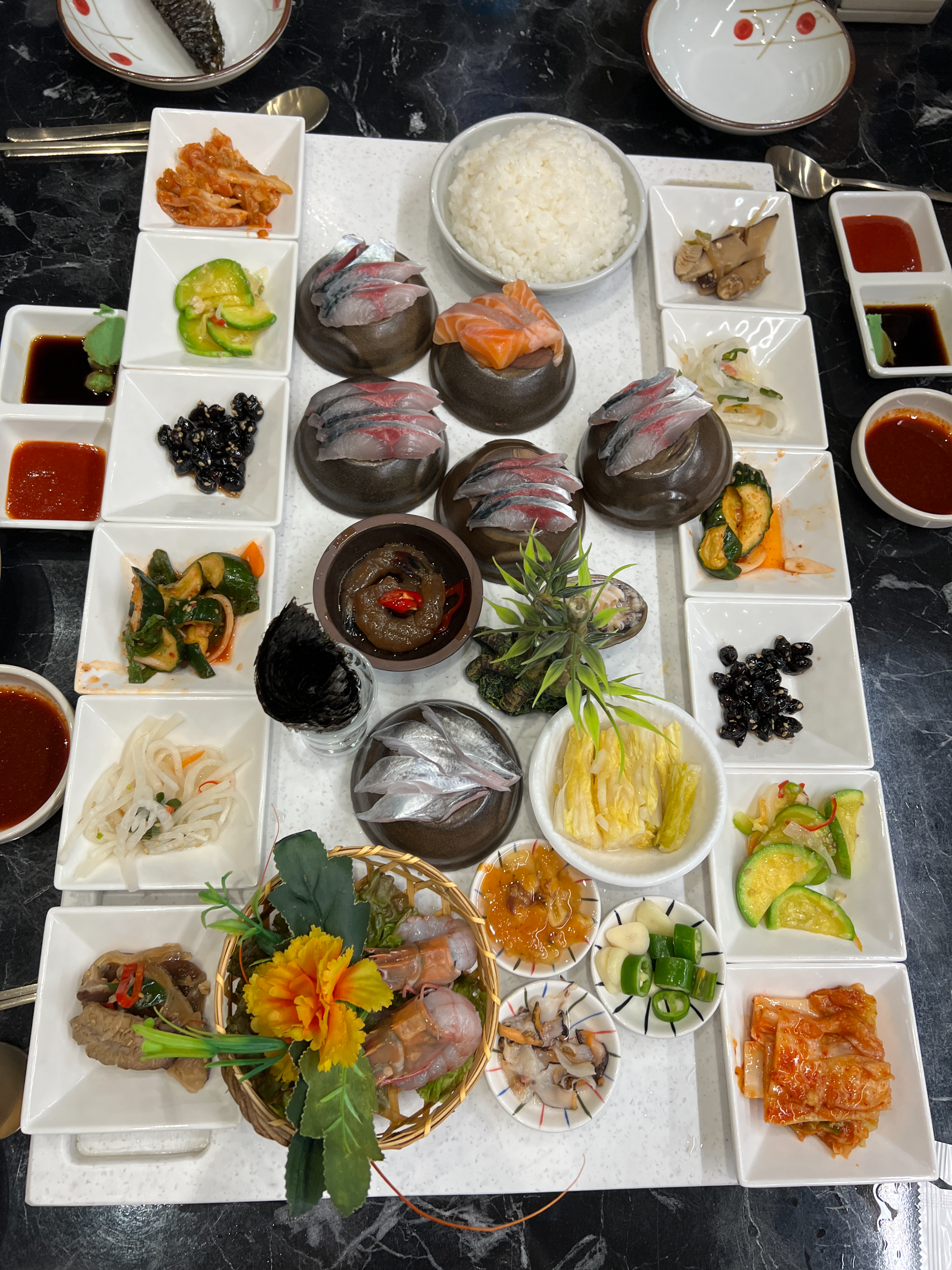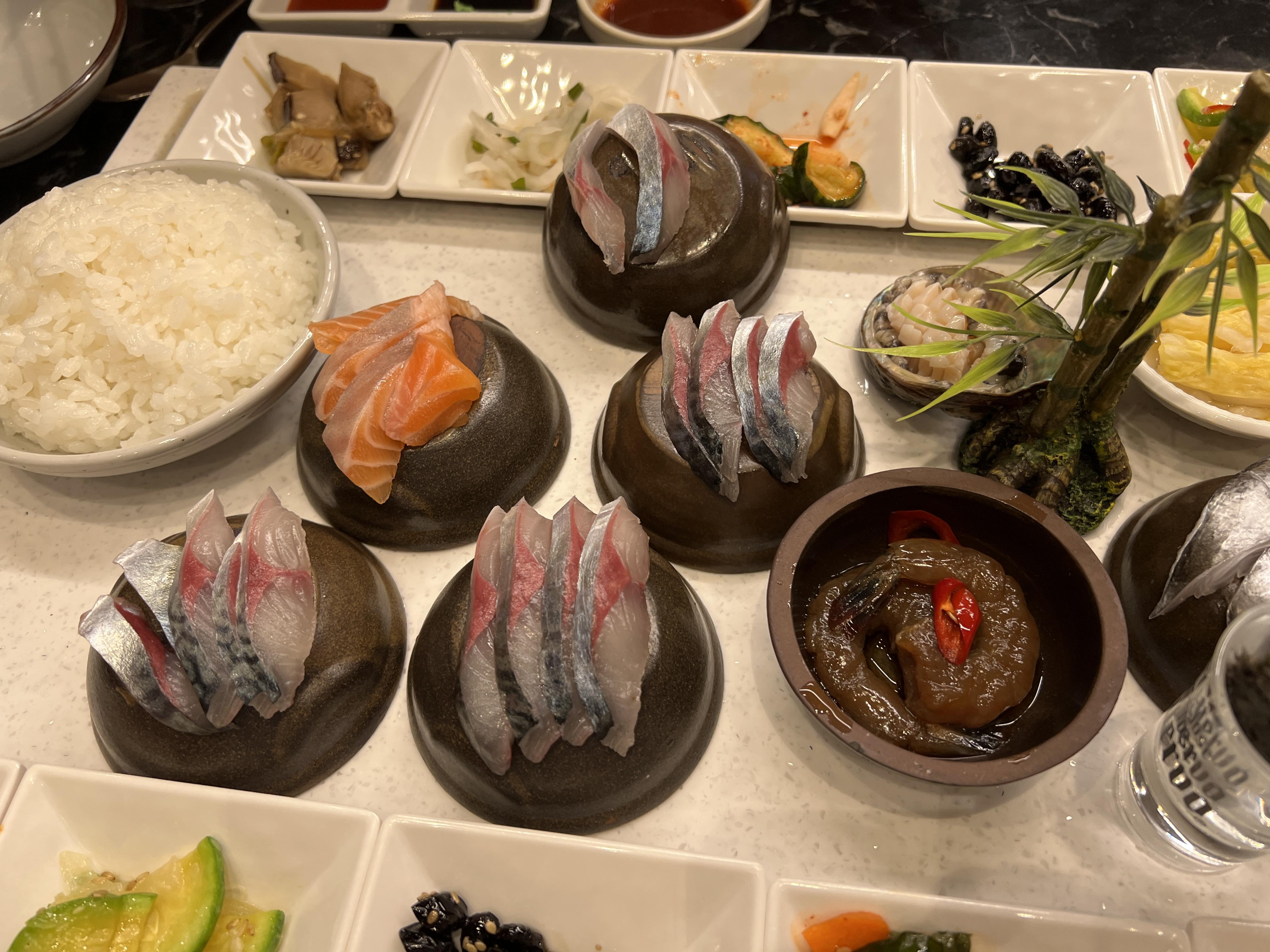 몇가지 반찬들과 가운데 고등어회가 나오고 새우장, 연어회, 전복회, 갈치회, 딱새우회, 멍게회, 쁠소라회 이렇게 나와요.