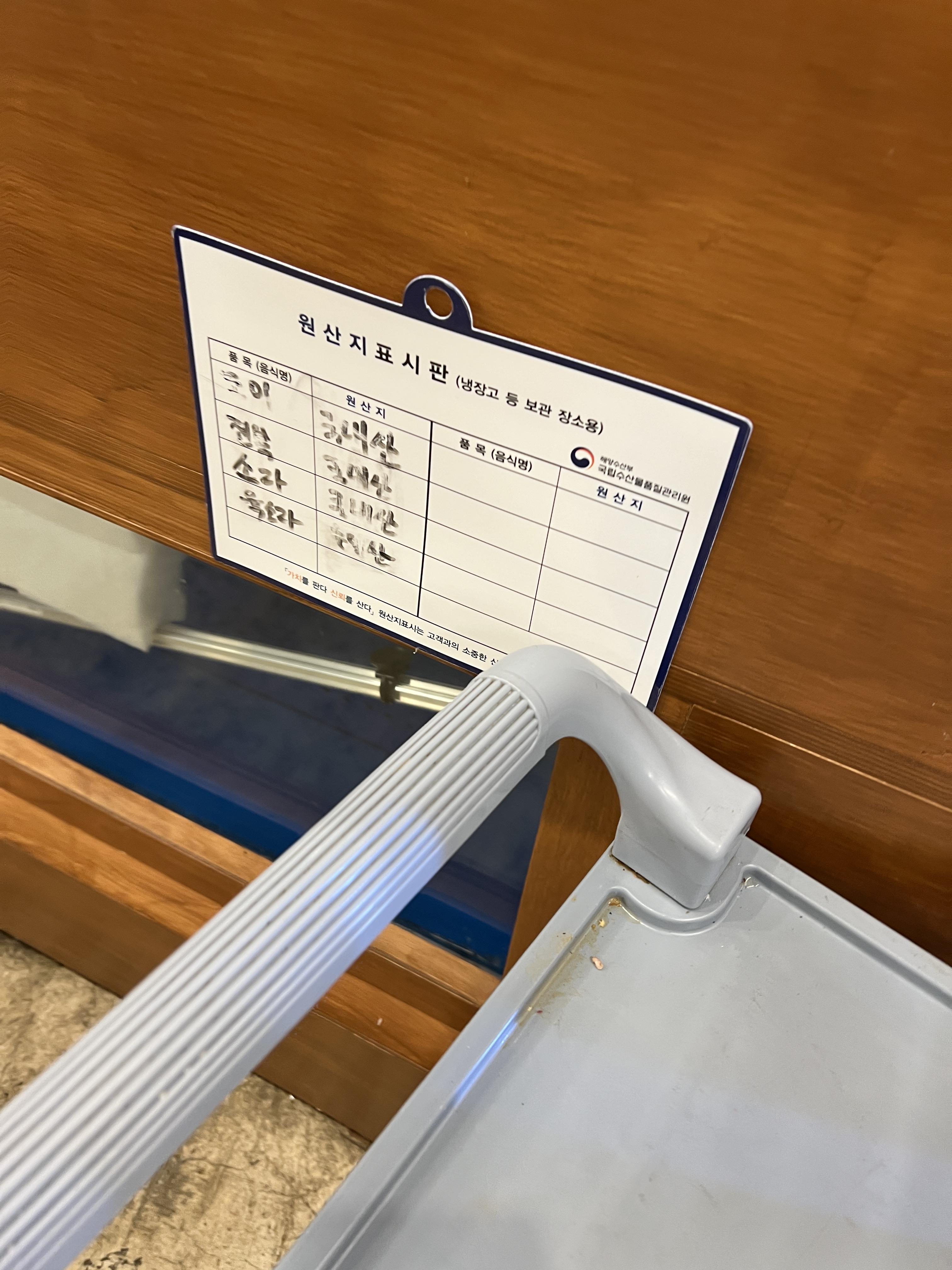 갈치 제주, 황게, 쌀, 돼지고기, 딱새우, 뿔소라, 전복 국내산, 고등어 구이 노르웨이, 사시미 국내산 이렇네 나눠져 있더라구요.