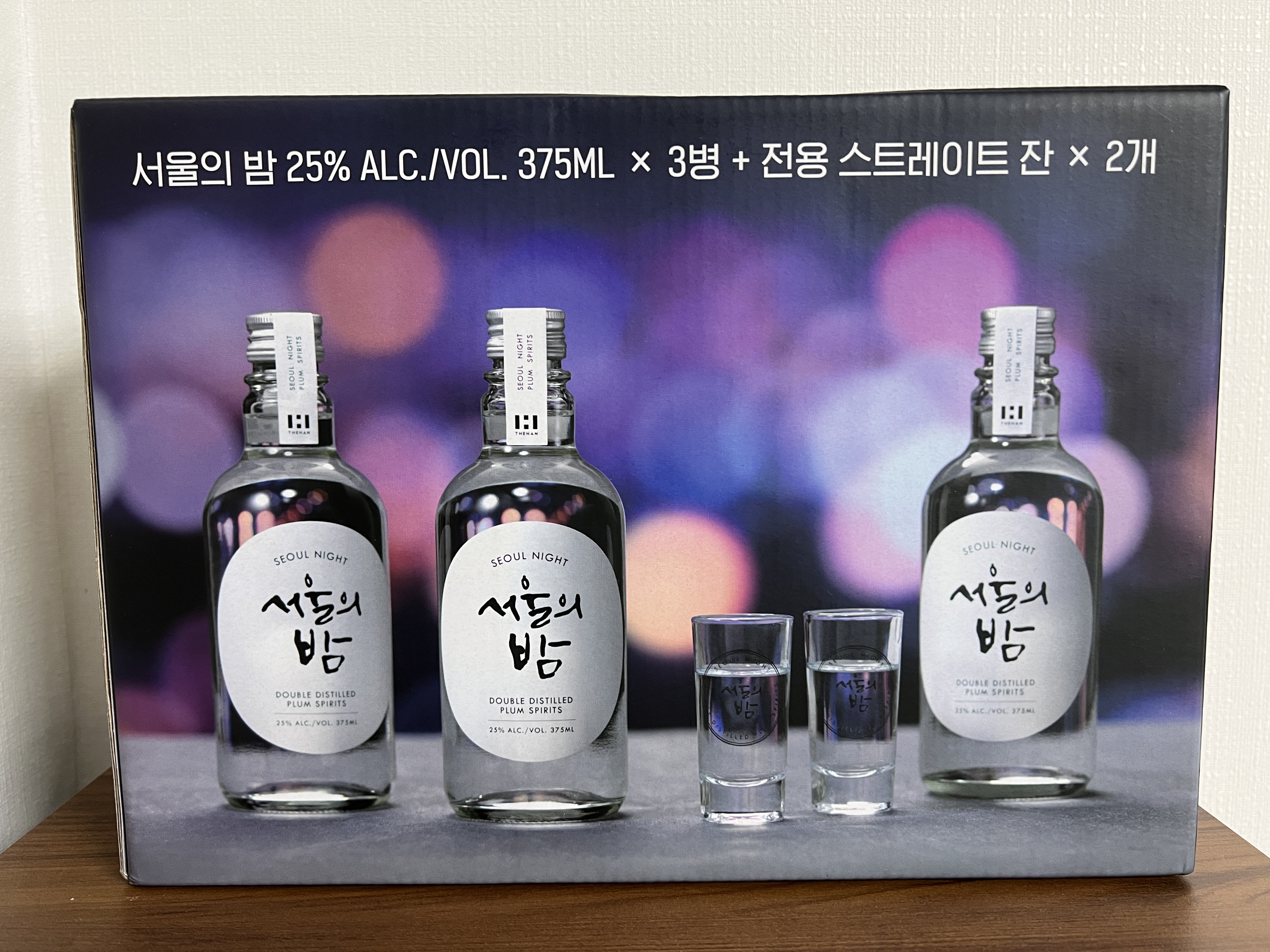 서울의 밤 3병이랑 전용 스트레이트잔 2개 이렇게 해서 세트로 팔고 있었어요.