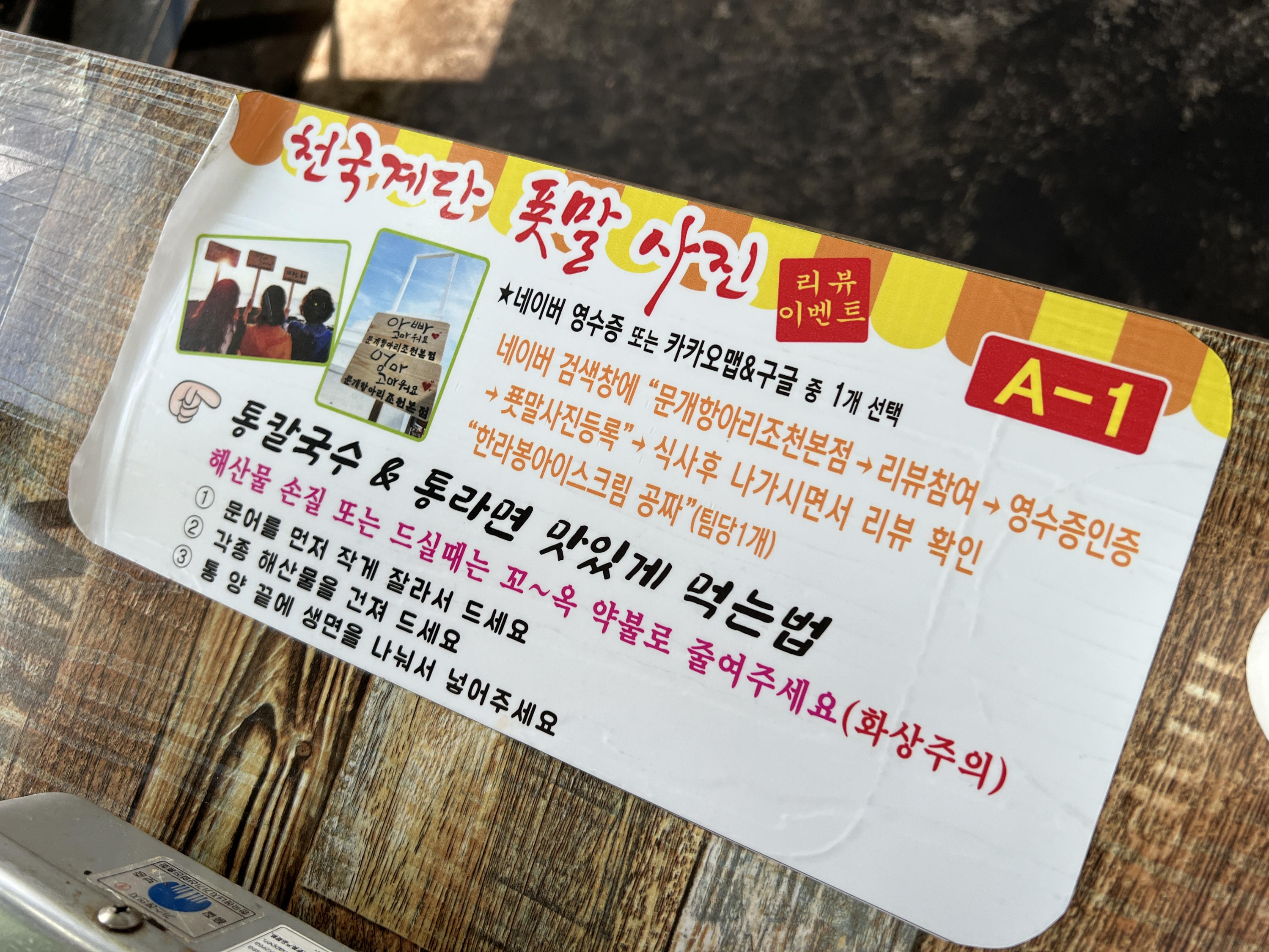 천국계단 푯말 사진 리뷰이벤트도 하는데 하면 한라봉아이스크림 공짜로 1개 받으실 수 있어요. 또 통칼국수, 통라면 맛있게 먹는법도 설명이 되어 있어요. 참고 하시면 되요.