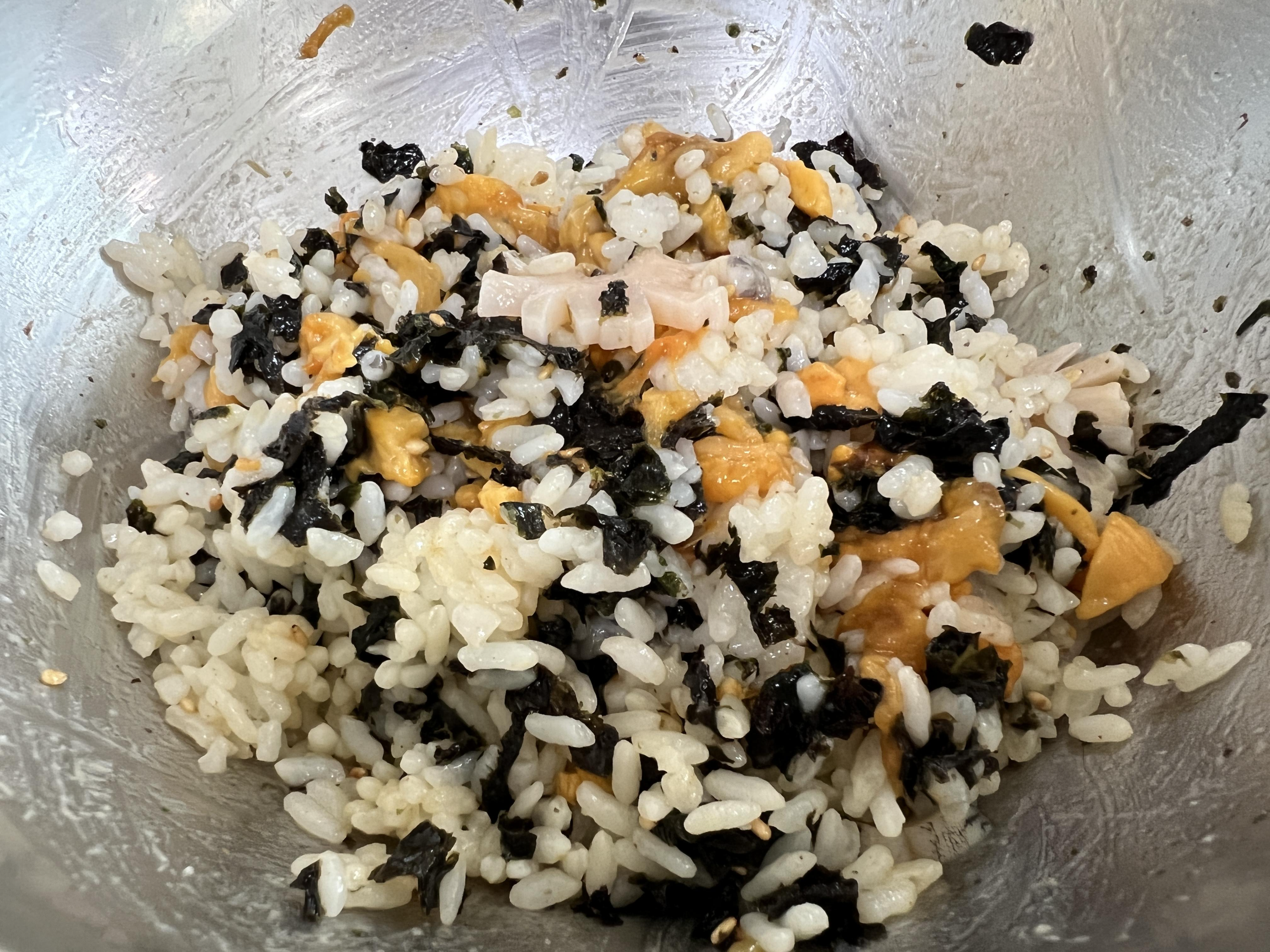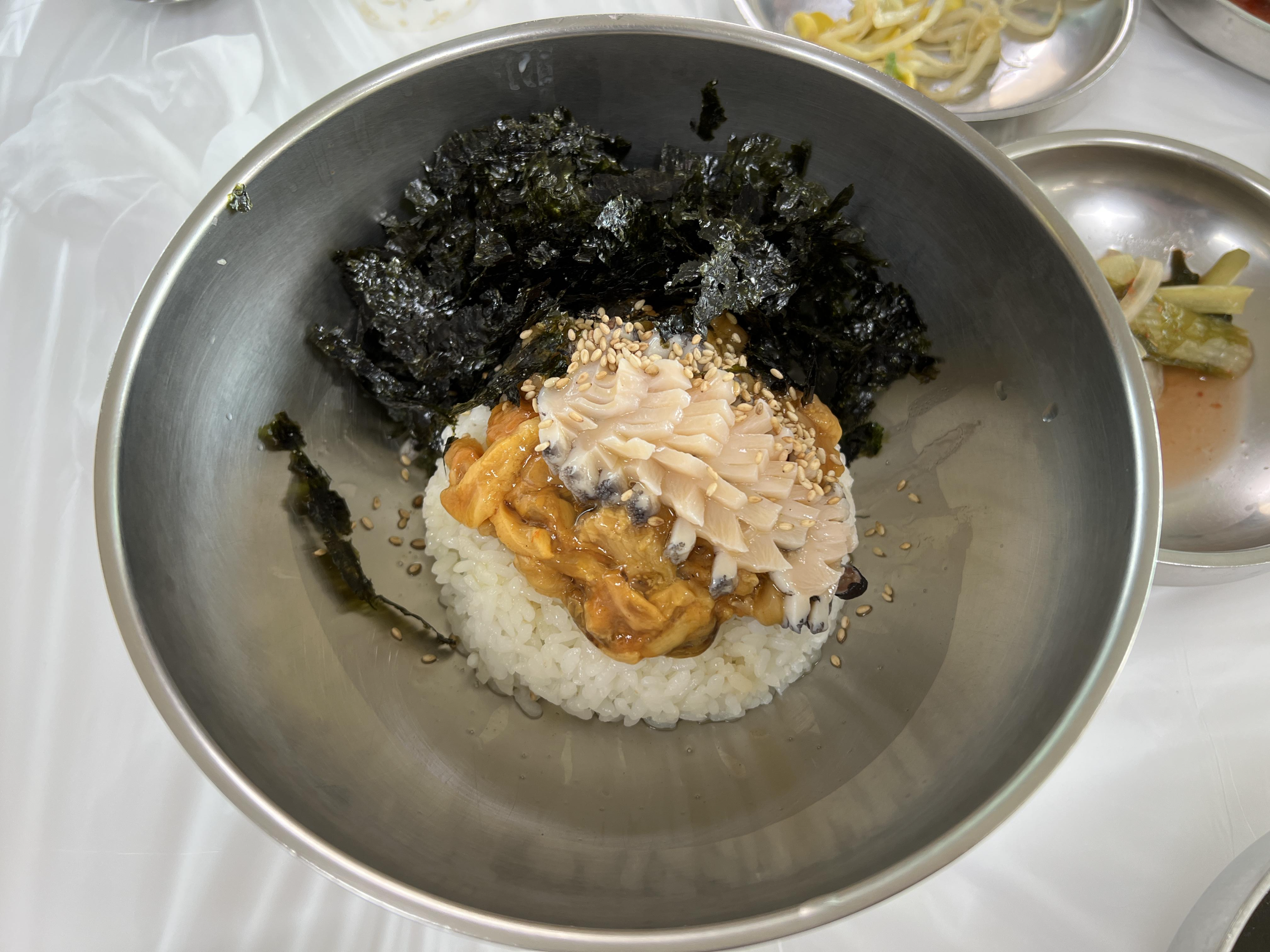 잘비벼서 한입 먹었는데 멍게가 숙성 멍게라서 조금 쓴맛이 있어서 호불호가 있을거 같더라구요. 그냥 생멍게는 끝에 단맛이 나는데 그걸 기대하고 먹으면 안될거 같아요. 전복이 또 들어 있으니깐 식감도 좋고 거기에 젓갈을 올려서 먹으니깐 딱 간이 맞더라구요.